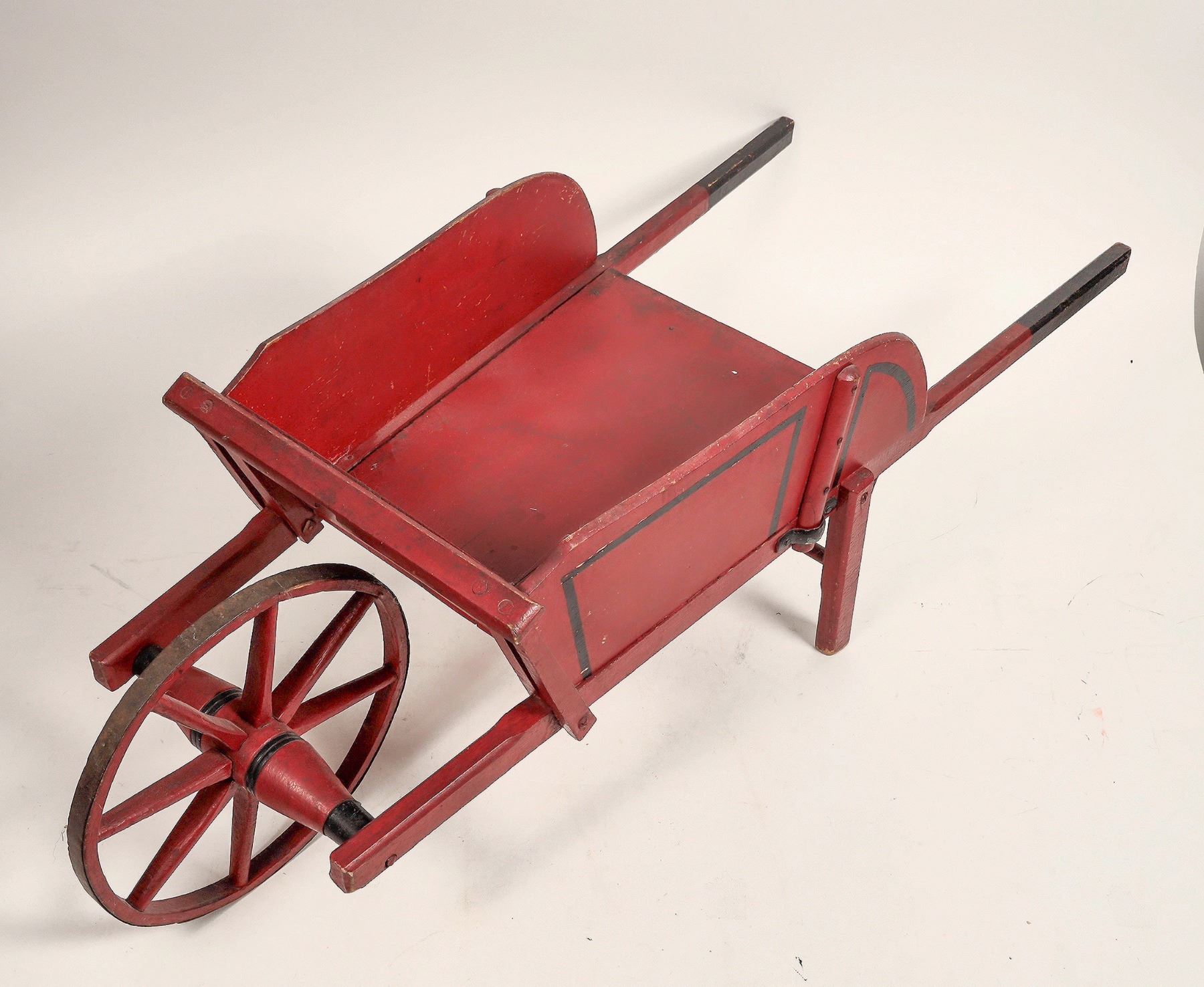 A little red wood wagon, for a child or garden decoration. It measures