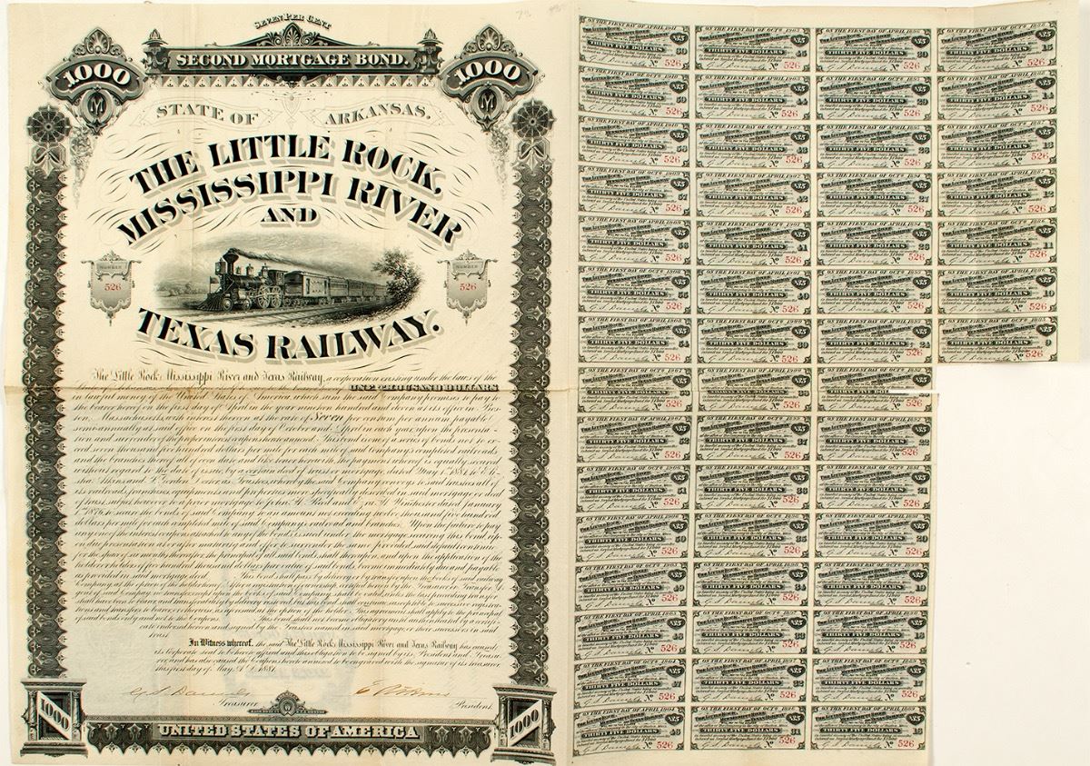 Very attractive second mortgage bond, $1,000, issued in 1881. Not cancelled. No. 526. Large vignette of locomotive. Very ornate border. Signatures of president and treasurer. Printed by American Bank Note Co. Fifty-two coupons attached. Heavy folds with separation and tape repairs. (Prag Collection) City: State: Arkansas Date: 1881 hwac# 33925