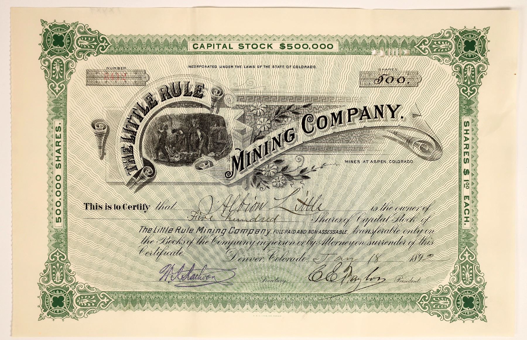 Mines at Aspen, Colorado (printed under logo). Inc. in Colorado. No. 3412, issued for 100 shares to Albion Little on Jan. 18th, 1892 in Denver. Signed by president C.E. Taylor and secretary H. Rathon. Not cancelled. Green border and background. Highly ornate company title with mining vignette in the center. Printed by C&C Lith., Denver. Folds, clean. 8.5 x 12" The Little Rule was located in 1880. It was situated at the head of Ophir Gulch in the Roaring Forks District. Quartz with galena and copper; 56 ounces silver per ton. [Ref: 1883 CO Mining Directory, pg. 577]