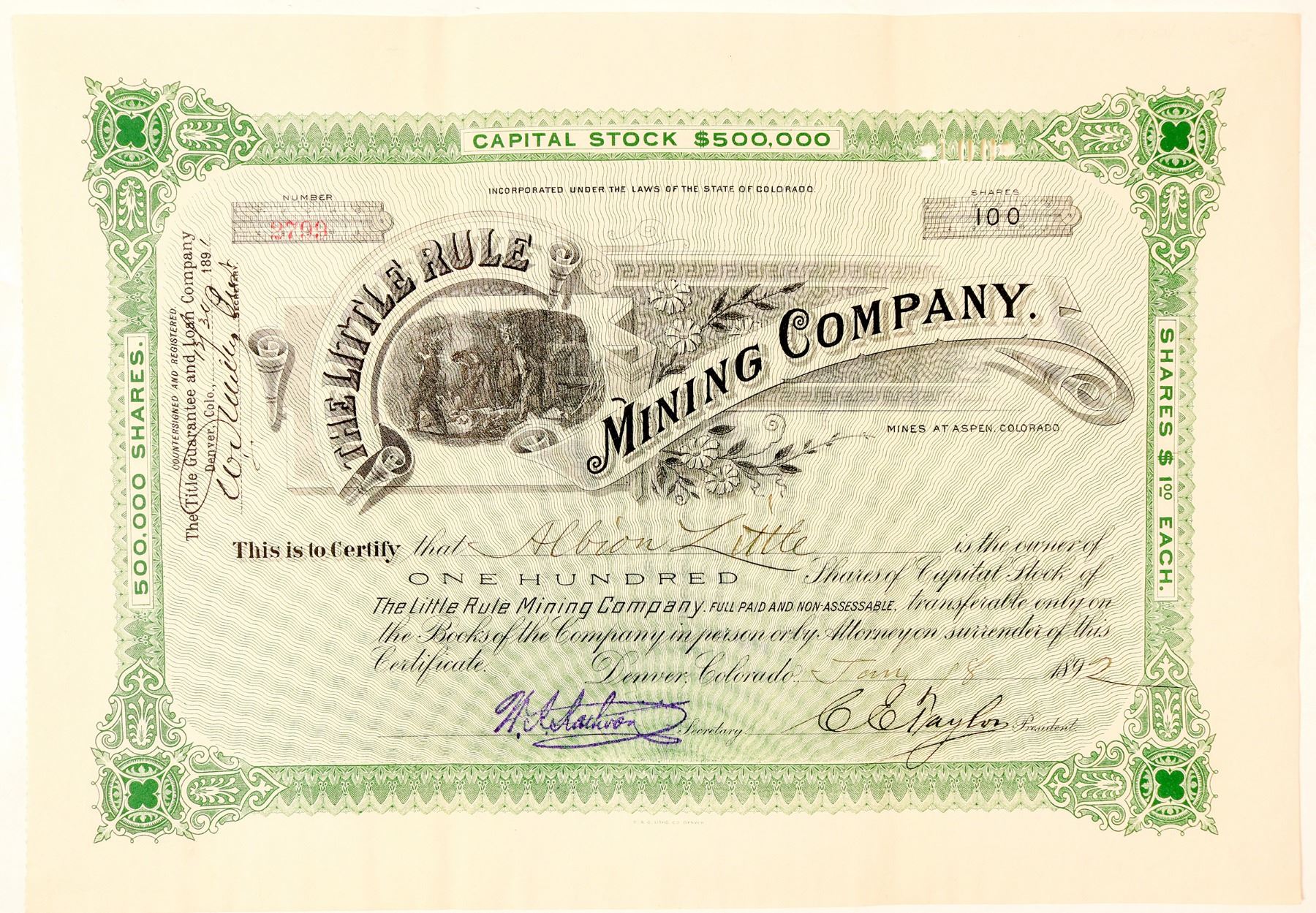 Mines at Aspen, Colorado (printed under logo). Inc. in Colorado. No. 2799, issued for 100 shares to Albion Little on Jan. 18th, 1892 in Denver. Signed by president C.E. Taylor and secretary H. Rathon. Not cancelled. Green border and background. Highly ornate company title with mining vignette in the center. Printed by C&C Lith., Denver. Folds, clean. 8.5 x 12" The Little Rule was located in 1880. It was situated at the head of Ophir Gulch in the Roaring Forks District. Quartz with galena and copper; 56 ounces silver per ton. [Ref: 1883 CO Mining Directory, pg. 577] () Ken Prag Collection