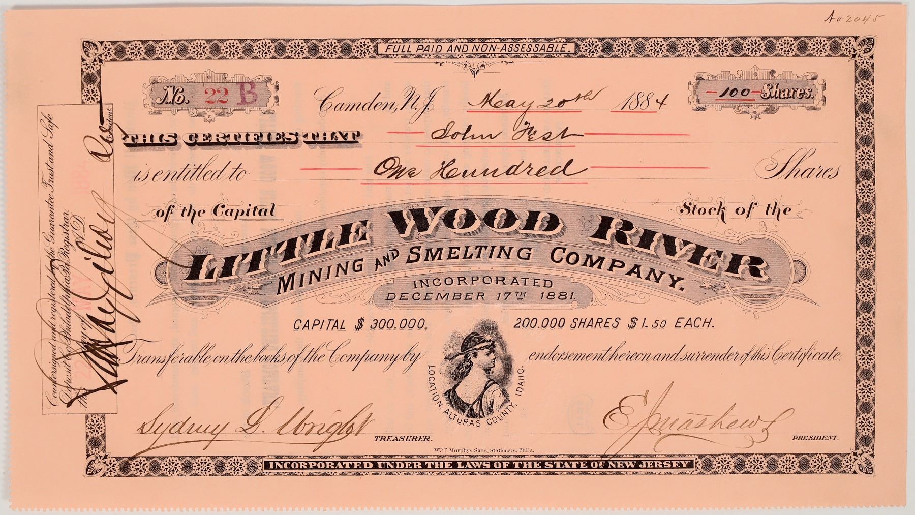 "Location Alturas County, Idaho" (printed around vignette of woman). Inc. in New Jersey. No. 22B, issued for 100 shares in Camden in 1884. Signed by the president and treasurer. Not cancelled. Black print on salmon paper. Pinholes, folds. This company operated in Garfield Canyon, Little Wood River District, Alturas (now Garfield) County.