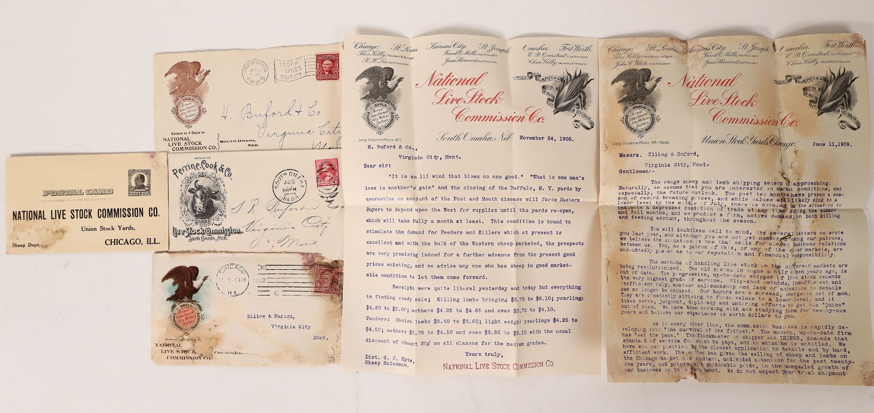 Group of livestock advertising ephemera. 3 pictorial covers, c. 1894-1909-eagle cover stained. 1909 National Live Stock Commission 2 page letterhead and postcard-stained.