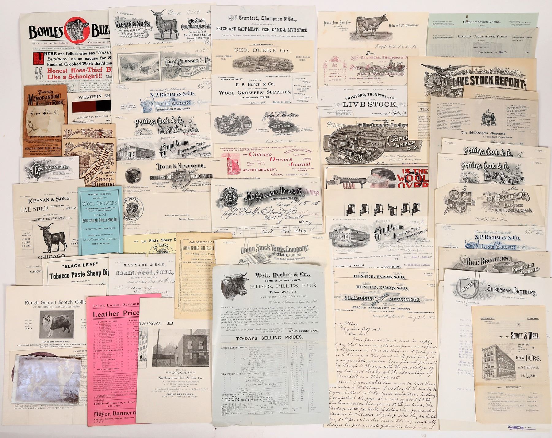 About 40 livestock letterheads with livestock in titles, many with nice pictorials of livestock c. 1879-1901. Other livestock related ephemera including several sheep dipping booklets, pricelist etc.