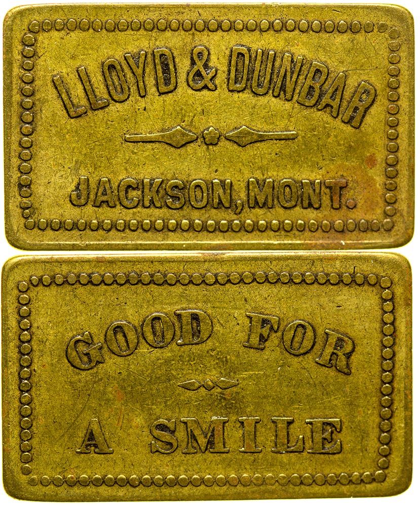 R-9. Lloyd & Dunbar / Jackson, Montana // GF / A Smile. Rectangular, brass, 32mm x 19mm. (Svoboda Collection) City: Jackson State: Montana Date: HWAC# 35055