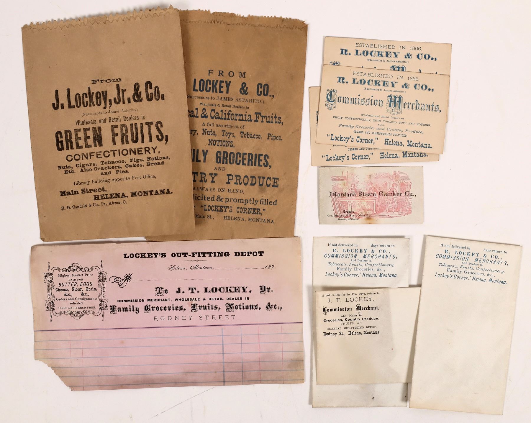 3 unused small advertising covers-2x R Lockey, JT Lockey. Business cards-3x R Lockey. Pictorial Montana Steam Cracker. JT Lockey billhead. R and J Lockey paper bags 7.25x5.25". Montana Helena