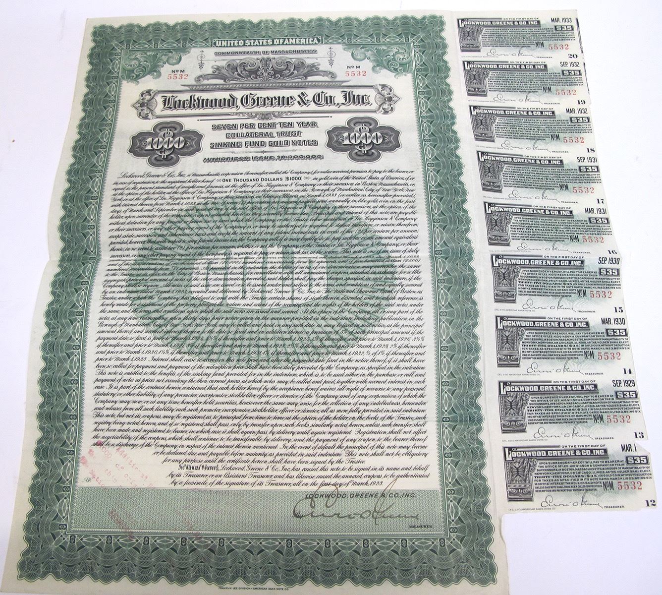 Involved with industrial engineering and construction. Lockwood, Greene & Company was established on March 1, 1882 by Amos D. Lockwood and Stephen Greene, in Providence, Rhode Island. It was the successor to A. D. Lockwood & Company. Later relocated to Boston. Rare $1000 7% gold bond. Signed by treasurer Edwin Greene. #5532. 14.75" x 10". Date: Location: Boston, Massachusetts HWAC# 53747