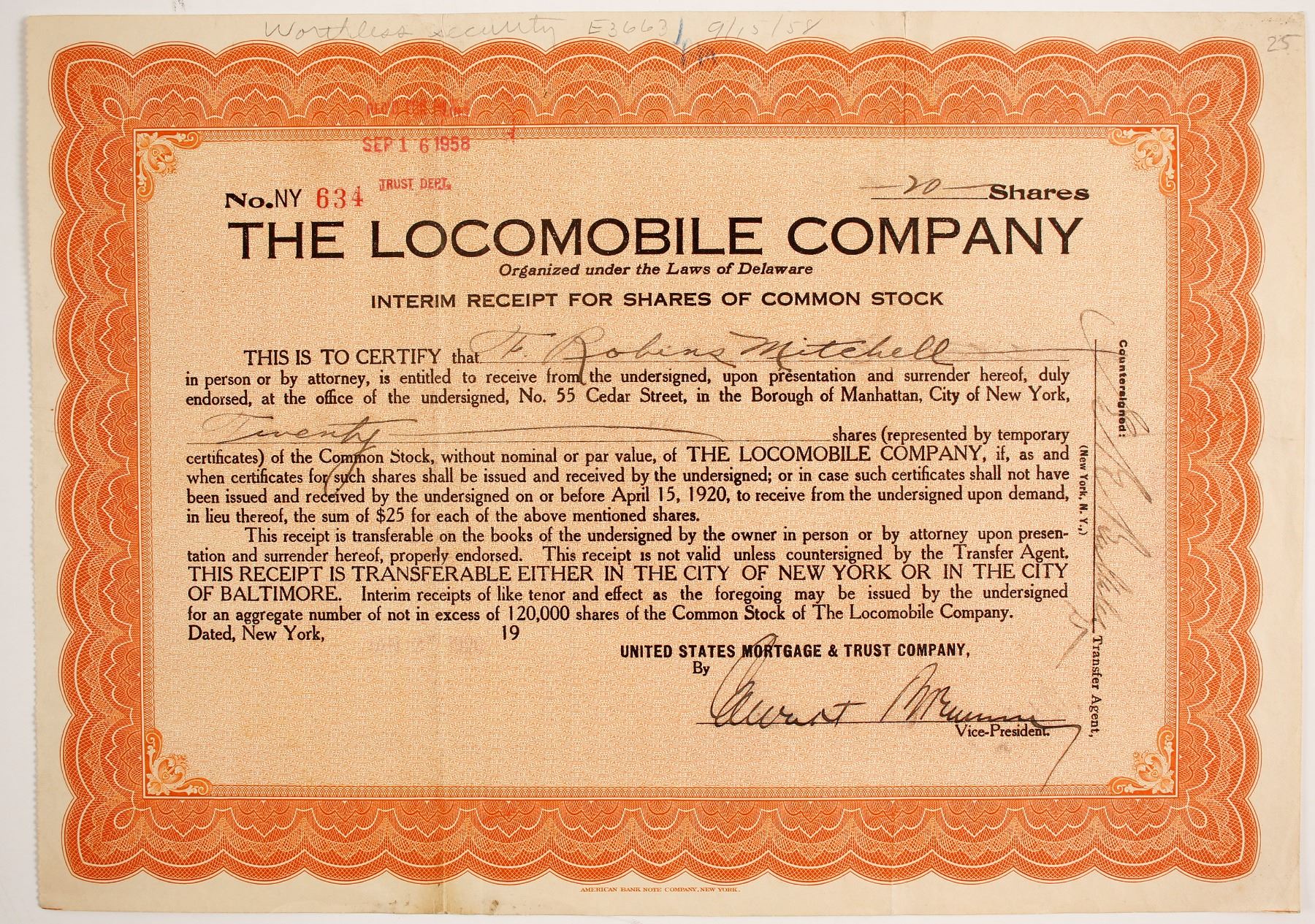 Interim receipt for 20 shares of common stock for Locomobile Co # 634 issued to F. Robins Mitchell signed Jan 27, 1920. Orange border. Locomobile Co. of America founded in 1899. Company name originated from combination "locomotive" and "automobile." Locomobile began by producing steam cars which had many faults. Cars liked by many people to get around fast and over 4,000 were built between 1899 and 1902. Gasoline internal combustion engine led to its' demise. Printed: American Bank Note Co., NY. New York