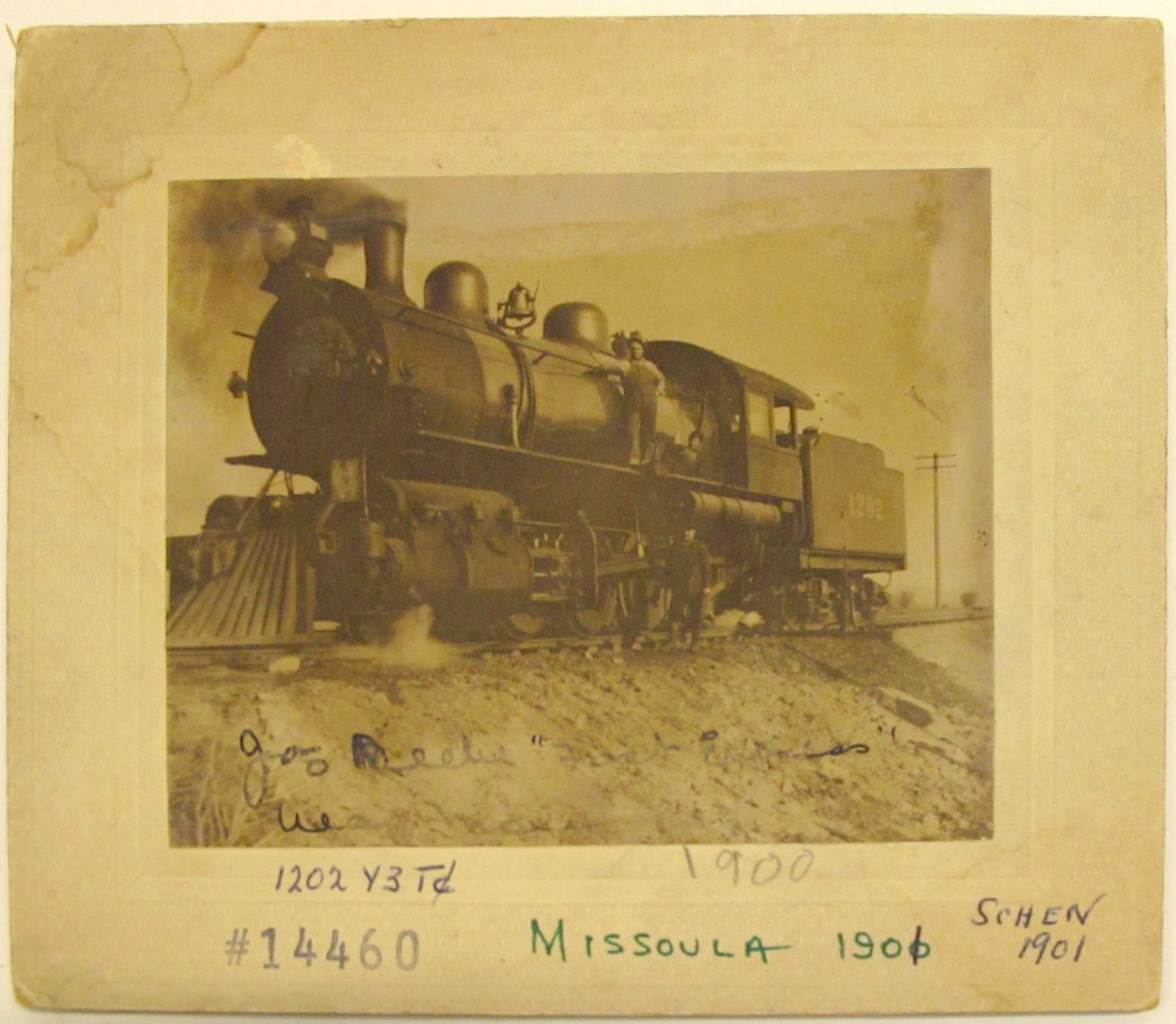 B/W matted photo of a locomotive and tender #1202. Writing on matting is Missoula1900/01, Schen 1901.train crew is standing on locomotive. Pen writing on photo. Water stains on matt and to 2 small corners of photo. Photo 3.75" x 4.5"