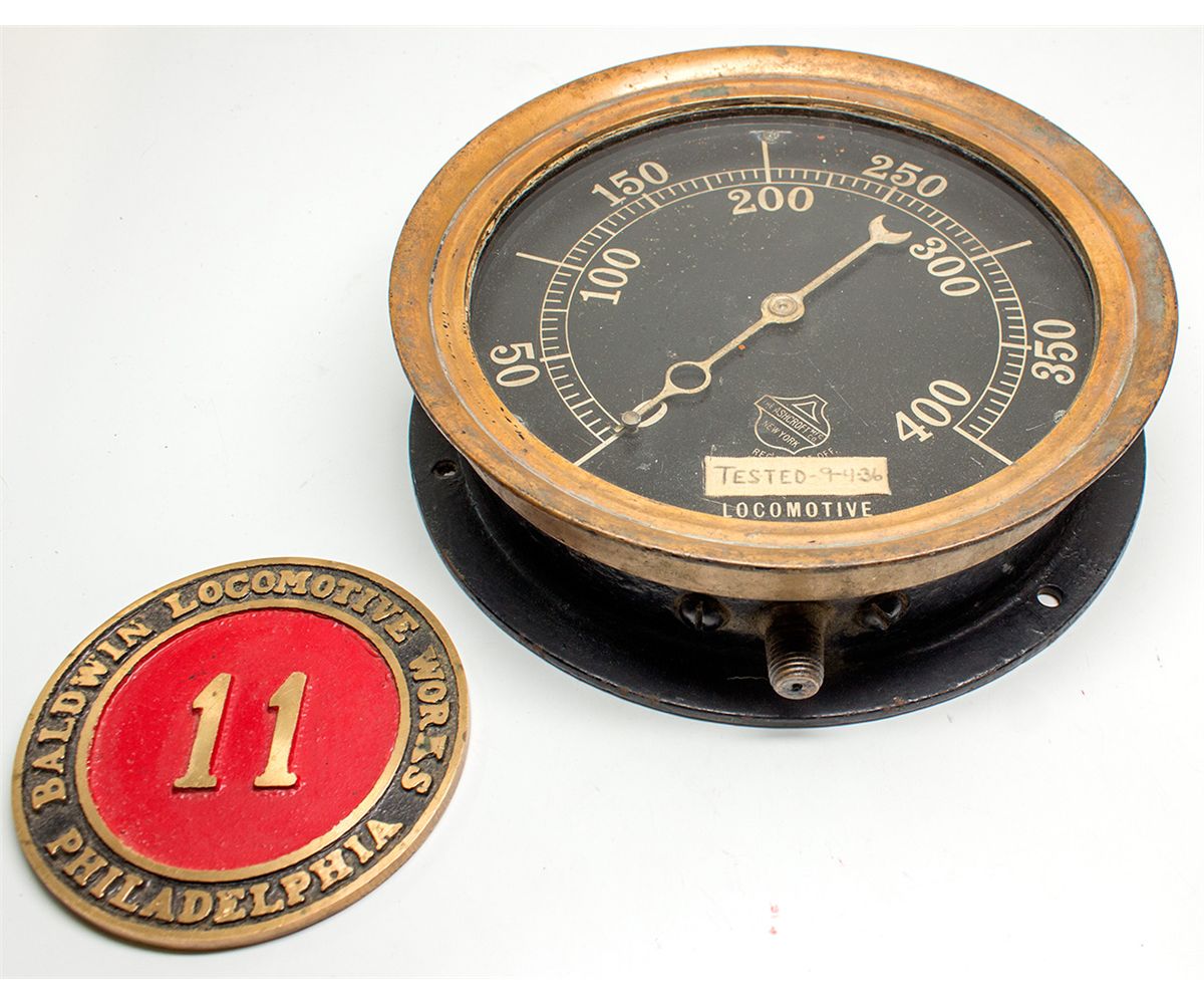 Lot of 2. 1) Ashcroft Manufacturing Co., New York. Locomotive steam gauge. Last tested 9-4-1936. From a large Virginia and Truckee collection, so most likely a V&T item. 8" diameter. Heavy. 2) Baldwin Locomotive Works, Philadelphia. #11. Engine plate. Probably a reproduction plate for V&T locomotive #11 Reno. 4" diameter. Both from the Gordon Harris estate.City: Virginia CityCounty: StoreyState: NVDate: