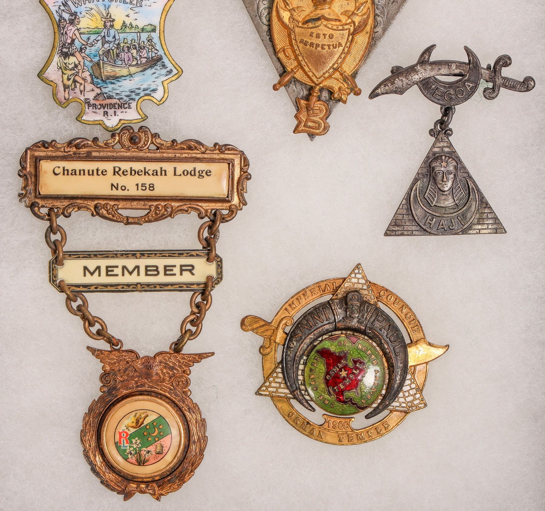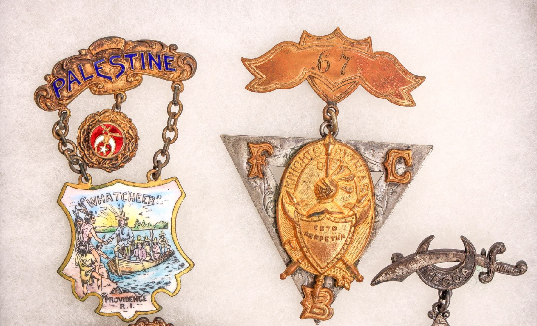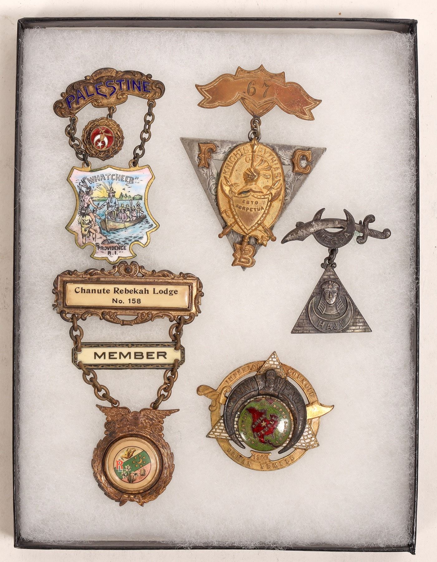 5 non Knights Templar badges. Palestine, Providence, RI. Knights of Pythian. MECCA, Haji. 1906 Osman Temple. Chanute Rebekah Lodge. [Providence] [Rhode Island]
