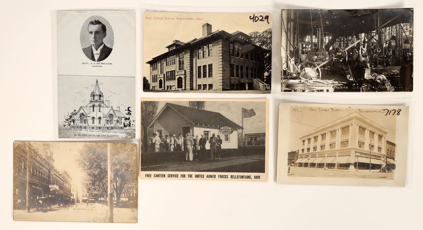 6 Bellefontaine postcards. RPC's- New Canby Blds., machine shop, street scene. Also, military canteen, new central school. Quincy church.[ Logan County Ohio