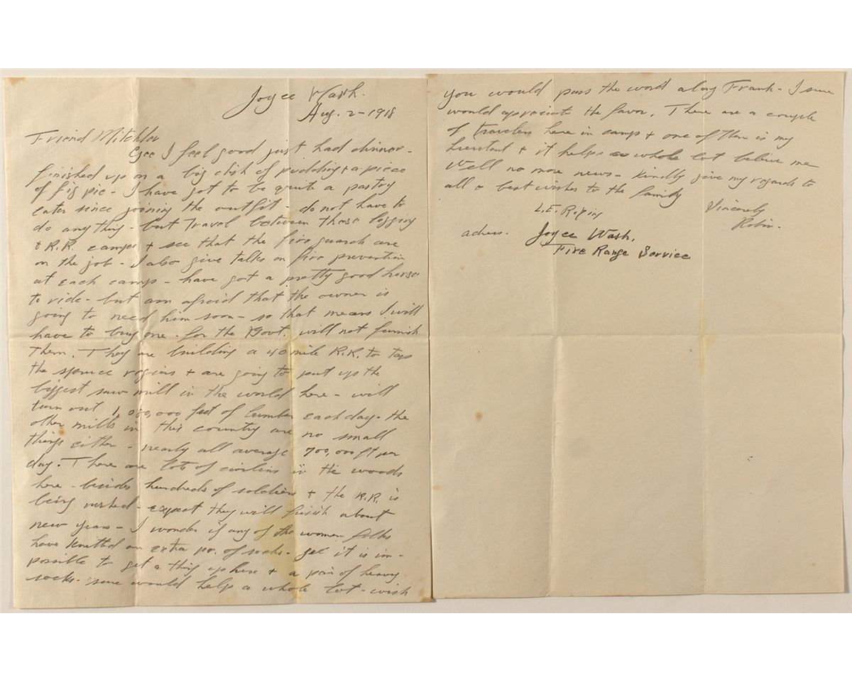 Letter from Joyce Wash, fire ranger to Frank Mitchler. She talks about going from logging camp to railroad camp giving lectures on fire safety. Mentions that they are building a 40-mile railroad to the top of the spruce region to service the largest lumber mill in the world that is being built. It will turnout 1,080,000 feet of lumber each day!City: Spruce RegionCounty: State: CADate: