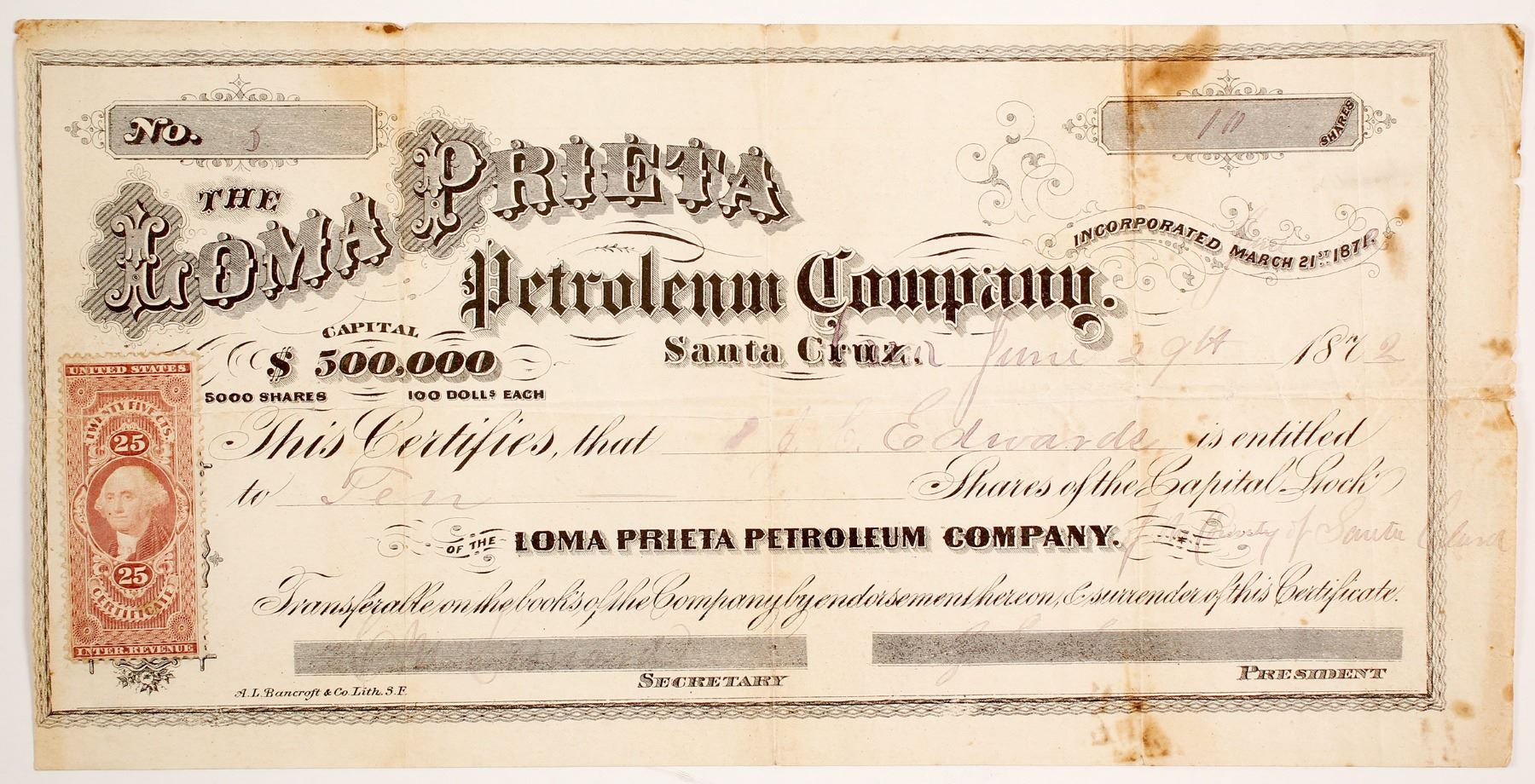 # 5 for 10 shares to Edwards. Signed by CM Leonard and president GL Seaver, Dateline 1872 Santa Clara. Incorporated March 21, 1871. 25c Certificate revenue stamp. Not Cancelled. AL Bancroft & Co. printer. Staining on right. Corner and fold issues. VERY EARLY number. Organized for extracting oil from land lying next to Oil Gulch and near the head-waters of Soquel Creek. Trustees were RH Whiteside, Charles Huff, Erastus B Hill, AW Saxe and PG Keith. Another company with the same name was incorporated June 21, 1872. That makes this company only lasting a little over one year! Leonard was the secretary and incorporator. Prag Collection City: Santa Cruz State: California Date: 1872