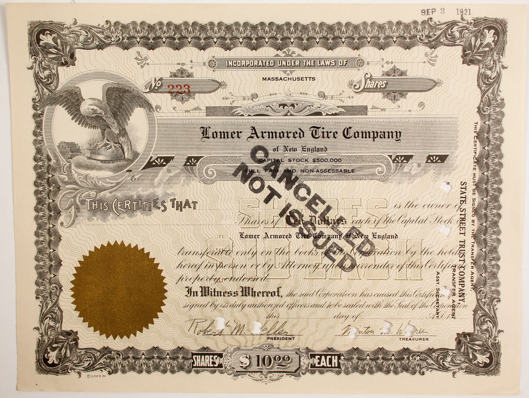 Cancelled, not issued stock of Lomer Armored Tire Company of New England, cert. # 223, dated Sept 2, 1921. Gold seal. Inc. MA. Signed Robert M. Heller, pres. Printed: GOES531. Ken Prag Collection