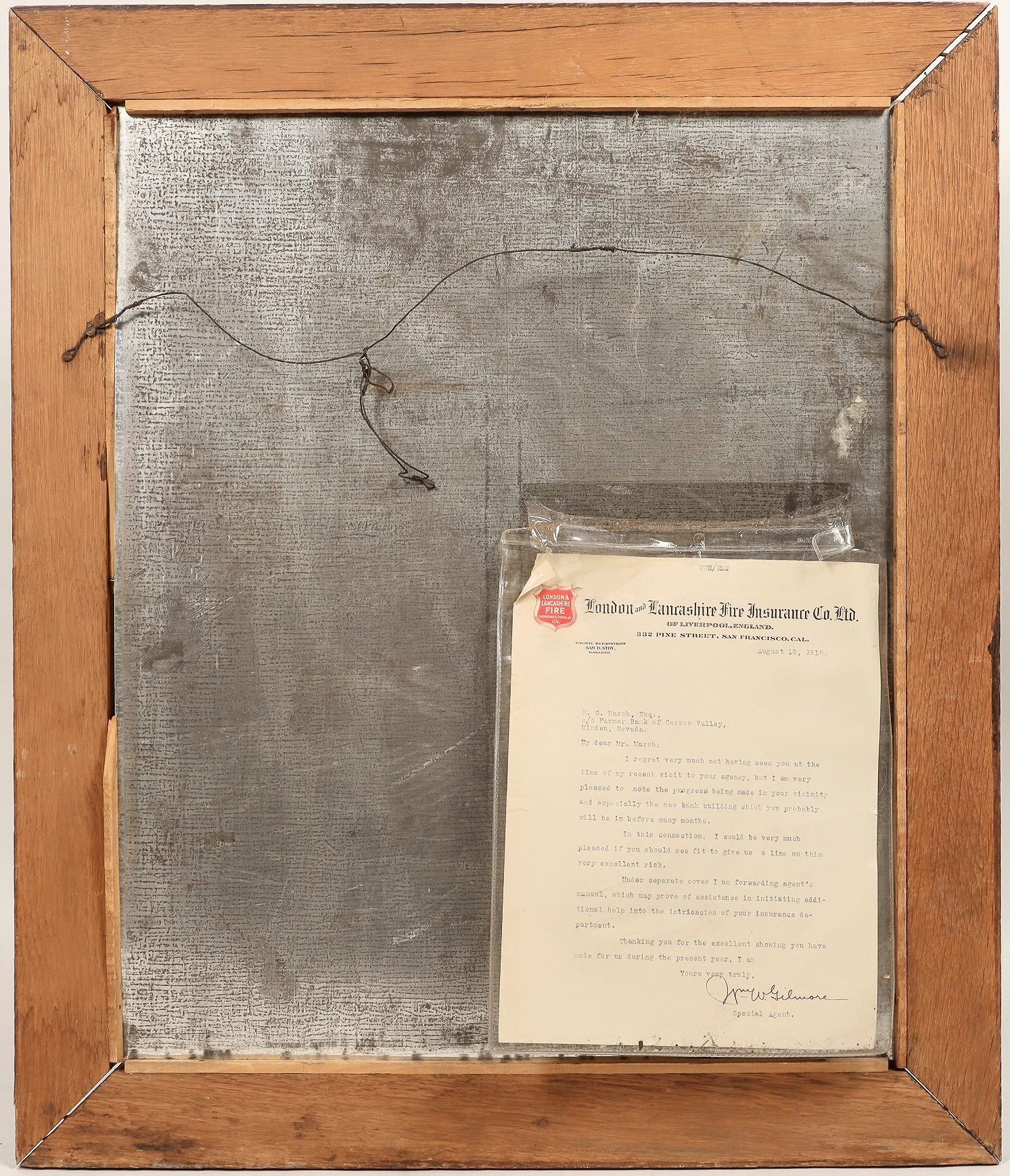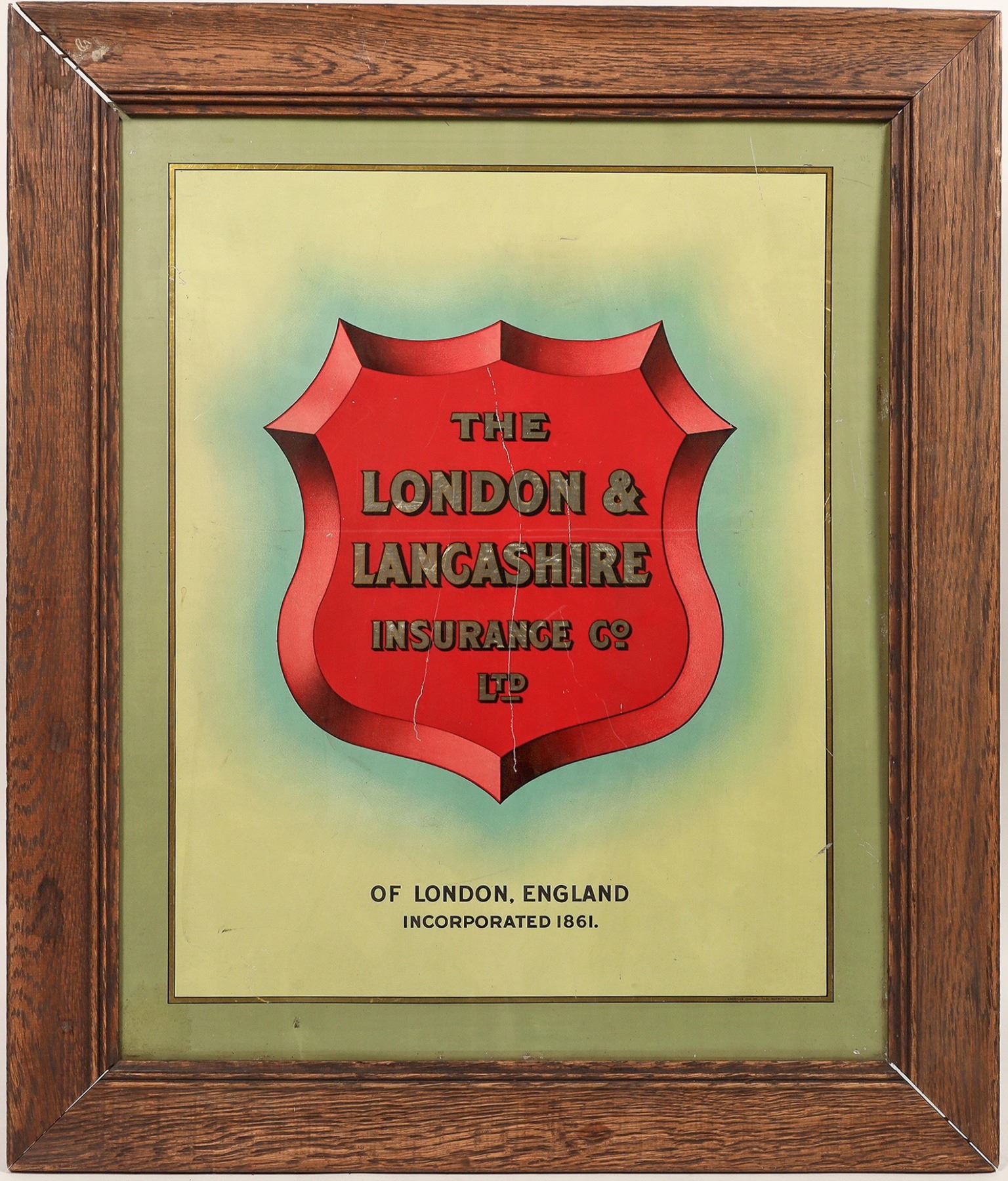 London & Lancashire Insurance Co. Tin Sign, c1880-1910, generally very fine except a few scratches at center. 22 x 26" outer dimensions, tin sign about 17.5 x 22". This company did business all over Nevada, particularly Virginia City, Eureka and Reno. From a very old Nevada Collection.
