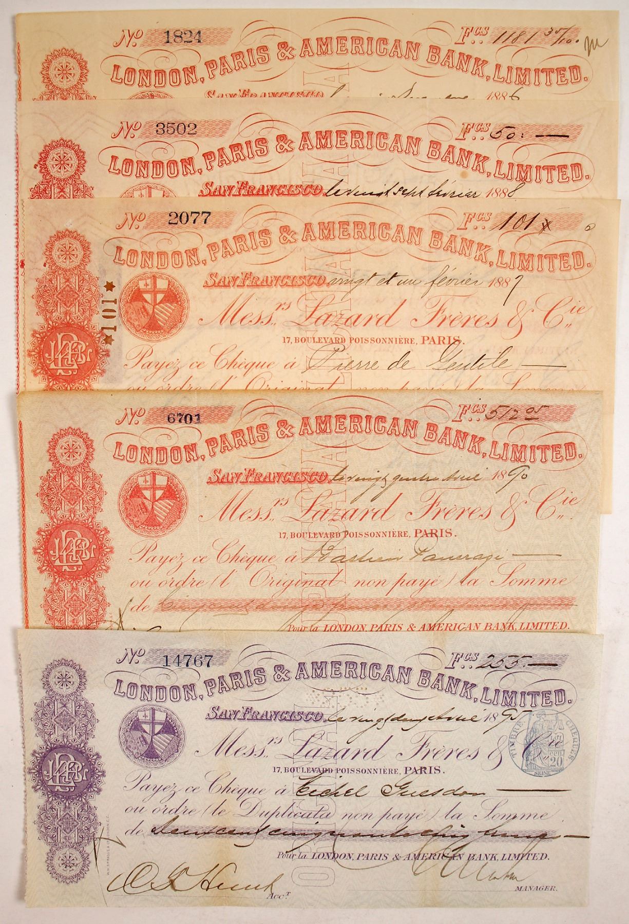 Lot of 5 issued 1886-1895. Most appear to Second of Exchange, while one may be a 3rd (text is in French). Red and purple print. This bank was the successor to Lazard Freres, managed by David Chan. After its merger with another bank in 1908 it changed names to the London, Paris National Bank, which lasted for one year. It later became the Anglo & London, Paris National Bank.