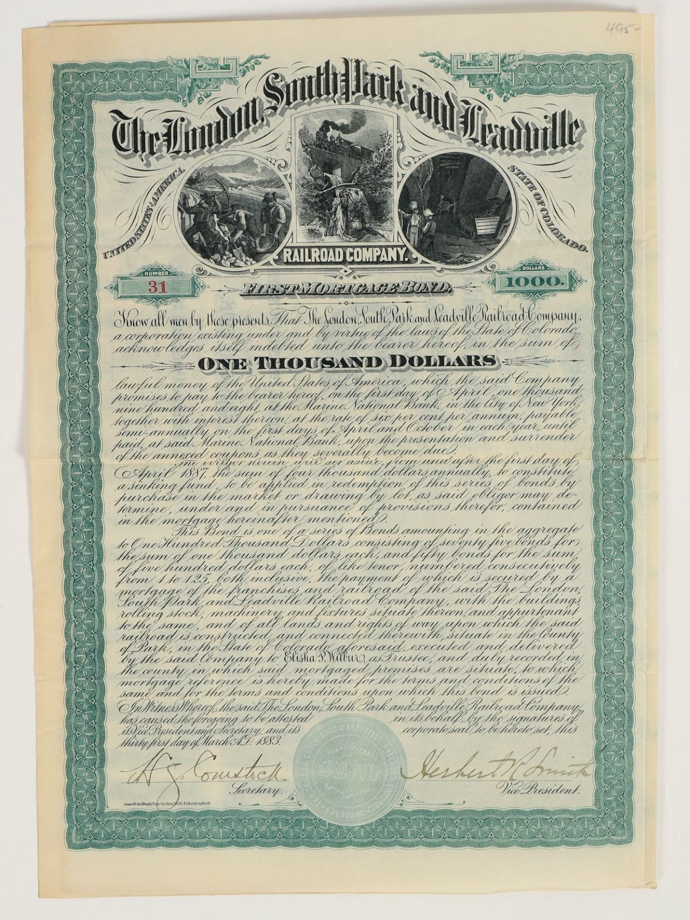 Incorporated in Colorado. Number 31, issued for $1,000 in 1883. Signed by Herbert R. Smith and H.G. Comstock. Printed by American Bank Note Co., New York. Size 9.25 by 12.75 inches. Not cancelled. Triple vignette: Miners above and below ground, and a train in the back ground, pulling up hill, and smoking away. Operated 1882-1885. Successor was the South Park and Leadville Short Line Railroad. According to Poors Manual of Railroads (1887), the railroad's line extended from a point on the Denver, South Park & Pacific Railroad near London Junction to the London Hill mines, a distance of 7.5 miles. Built by the London, South Park, & Leadville RR Co. with support from Union Pacific.