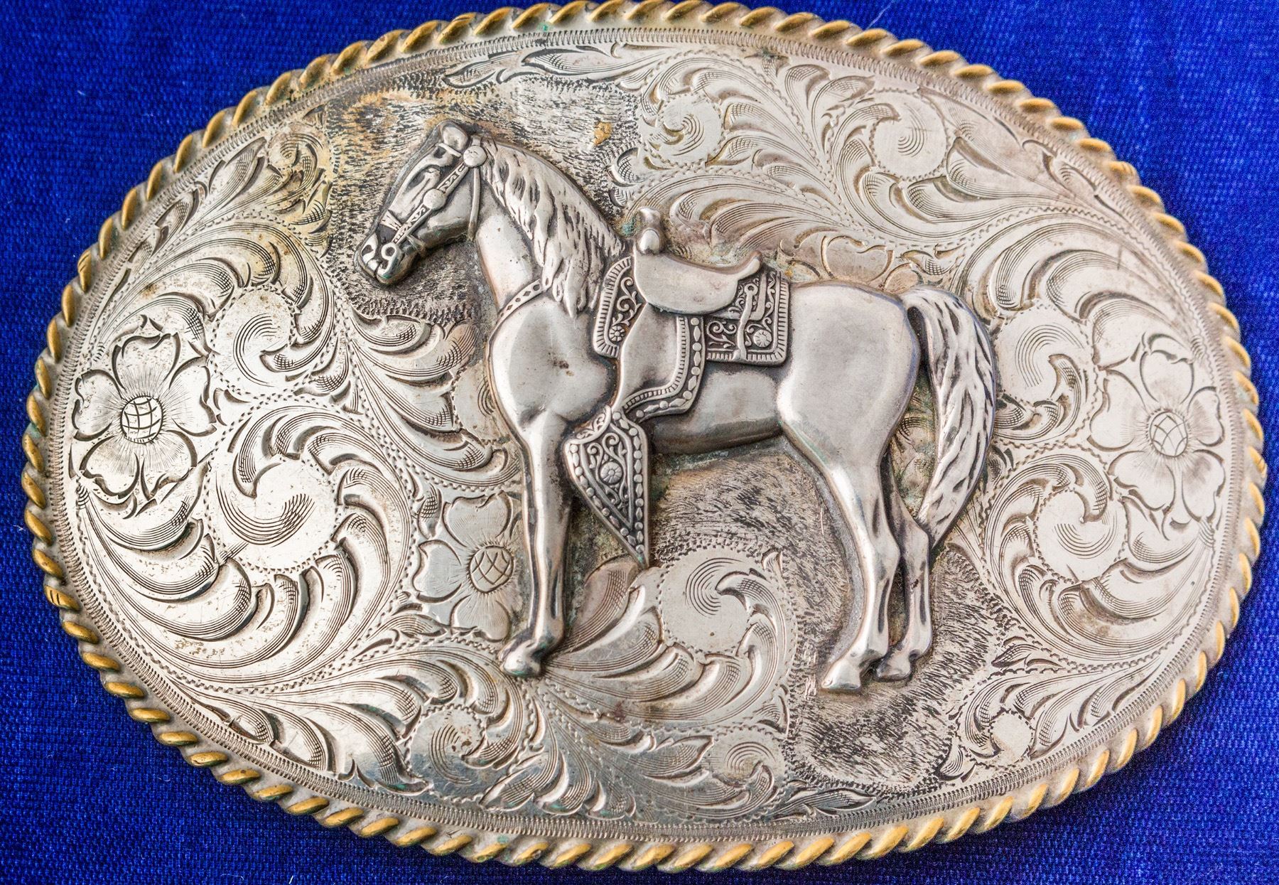 Large oval sterling silver planchet with detailed engraving/etching. Gold plated roped border. Lone horse - detailed with unusual looks like a tightly stippled halo effect around the horse. Seems like a very sentimental piece because of the unusual stippling effect. Horse very detailed with saddle and mane - horse briddle/bit distinct. Size: 5" x 3.5" Weight: 161.6 grams. Stamped: Eureka. Excellent condition. State: City: HWAC#: 47936 Date: