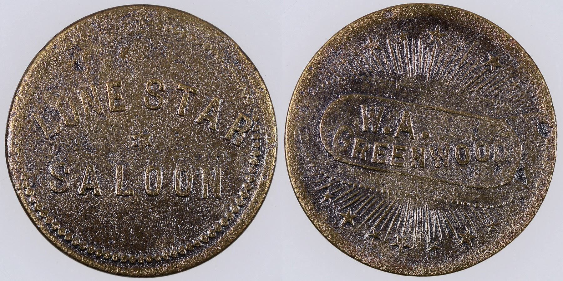 W.A. / GREENWOOD // LONE STAR / (star) / SALOON; Br., rd., 25 mm. (1888-1892).