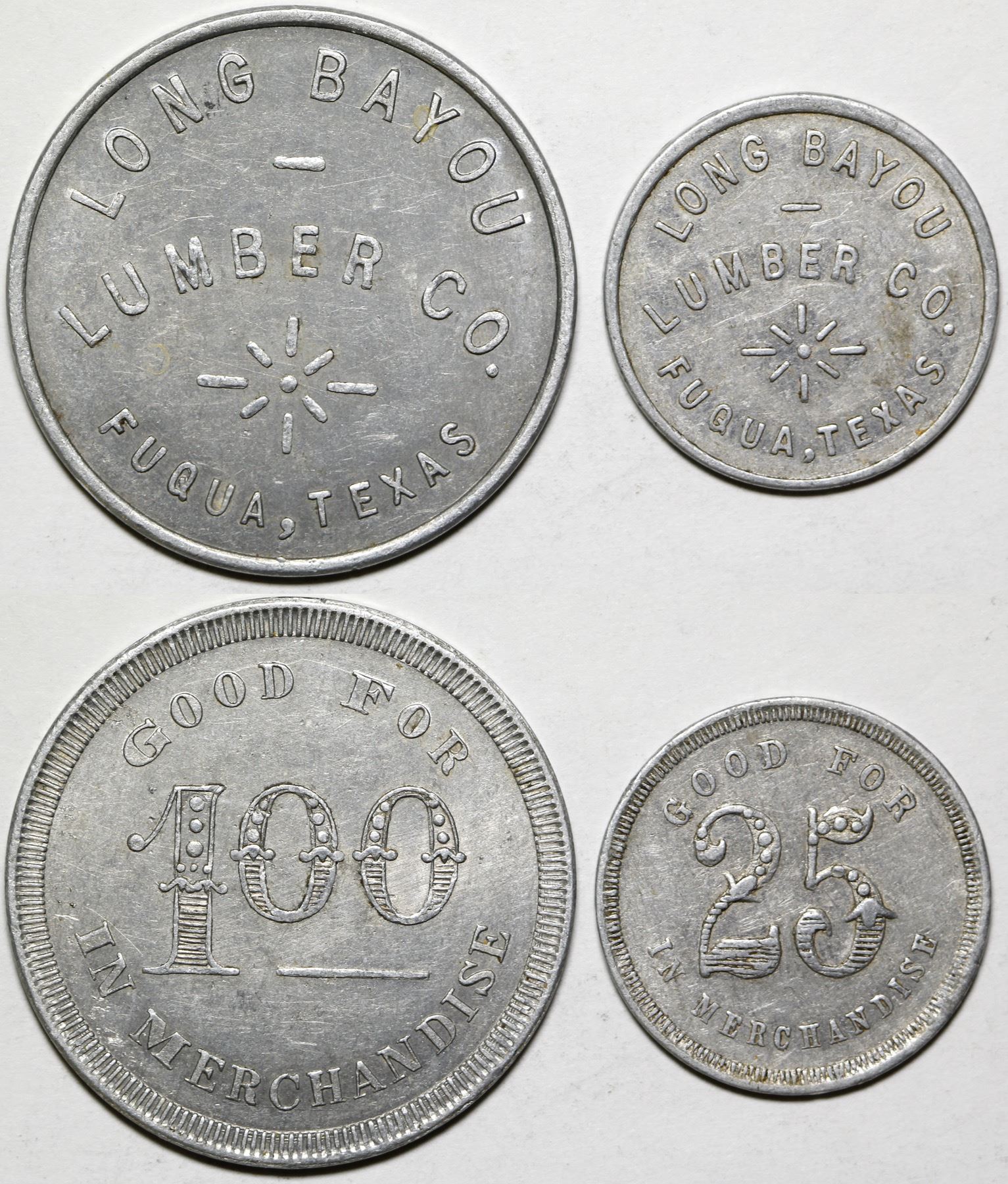 Two tokens, GF 25 and 1.00 IM. Very Clean condition. State: Texas City: Fugua Date: HWAC# 85350