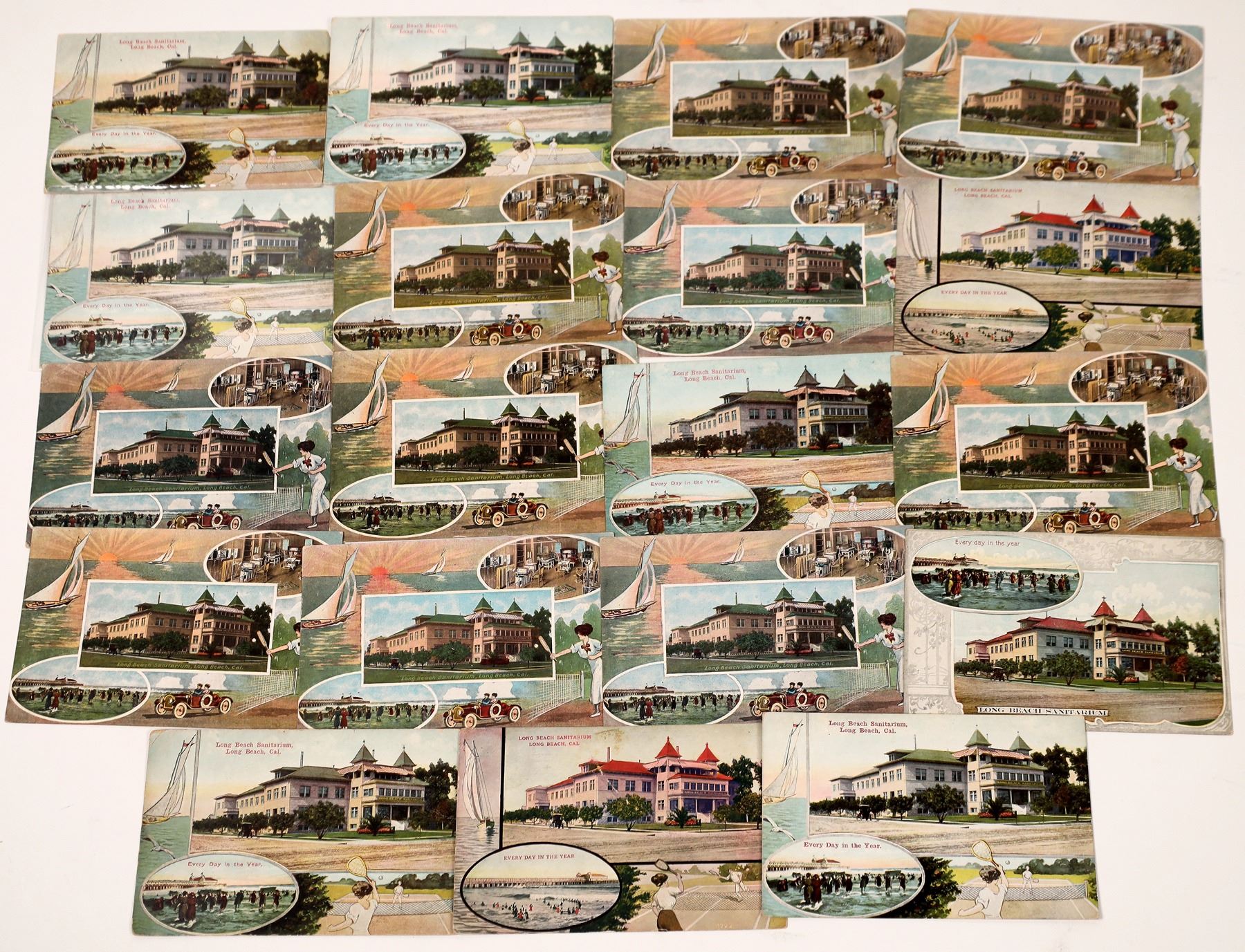Lot of 19. All the same color and borderless postcard, Back has description of the Sanitarium "Calif's foremost Health Resort", latest treatments and list of amenities and the front has multi images of the Sanitarium, Beach, Tennis Courts. . Seven postmarked w/ 1 cent stamps: Long Beach, L.A., Pasadena, Leavenworth.