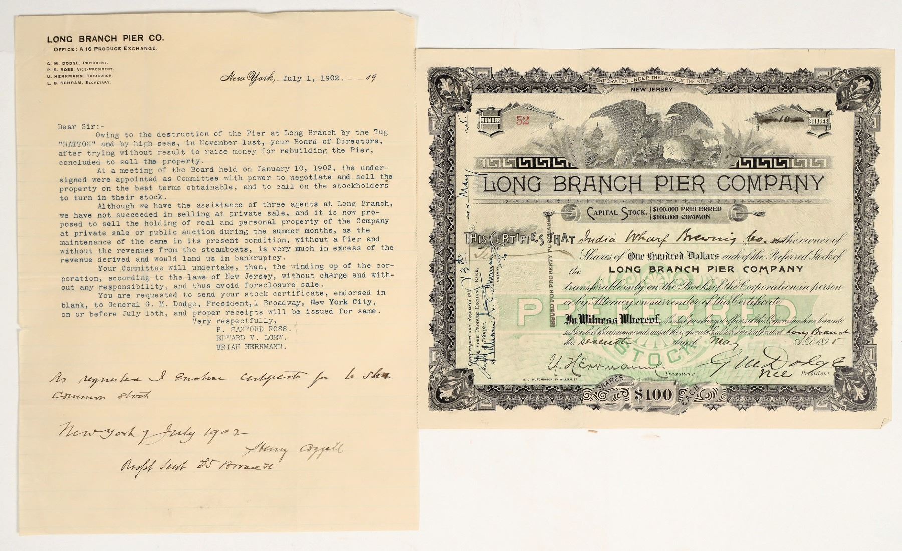 I/U, Long Branch Pier Co. Stock, issued March 1895. Vignette of spread wing eagle. Signed by Grenville M. Dodge V.P. R.G. Hutchinson printer. VG+ cond. Long Branch is one of the largest cities in New Jersey and the first glamorous resort in the nation. Eventually installing a race track and casinos.