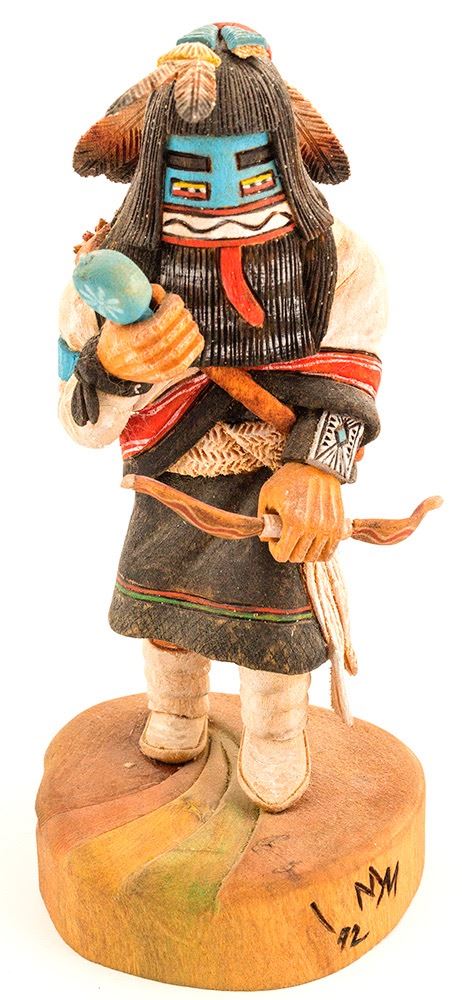 Long Hair Kachina by M.M. 7" x 3" x 3". Two feathers missing from headdress. The Long Hair Katsina is a singer of sweet songs who brings rain and flowers. His beard and loose tassels of feathers symbolize rain and clouds. They appear as dancers in a group at Niman and at plaza dances with manas. Their purpose is to bring rain, and it is said that they seldom dance without the appearance of a soft gentle rain. Date: 1992 Location: Hopi, Arizona HWAC # 49342