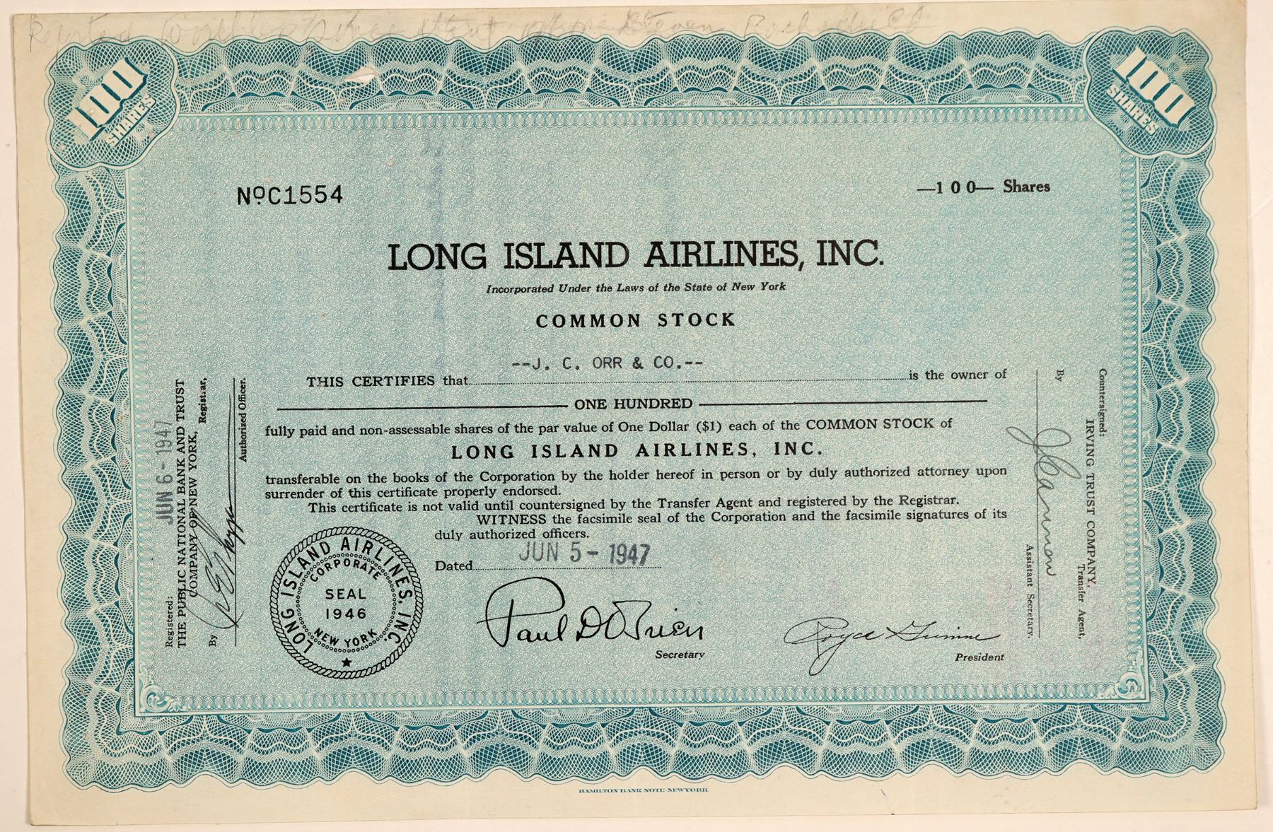 Inc. in New York. No. C1554, issued for 100 shares to JC Orr & Co. on June 5th, 1947. Printed signatures of the president (Royce Grimm) and secretary (Paul O'Brien). Not cancelled. Blue border and background, black print. 8 x 12" Folds. pinholes, pencil writing on front. Printed by Hamilton Bank Note Co., NY. Formed in 1946 with the purpose to offer to the communities of Montauk Point, Southhampton, Easthampton and Westhampton a much-needed commuters’ service. Ken Prag Collection