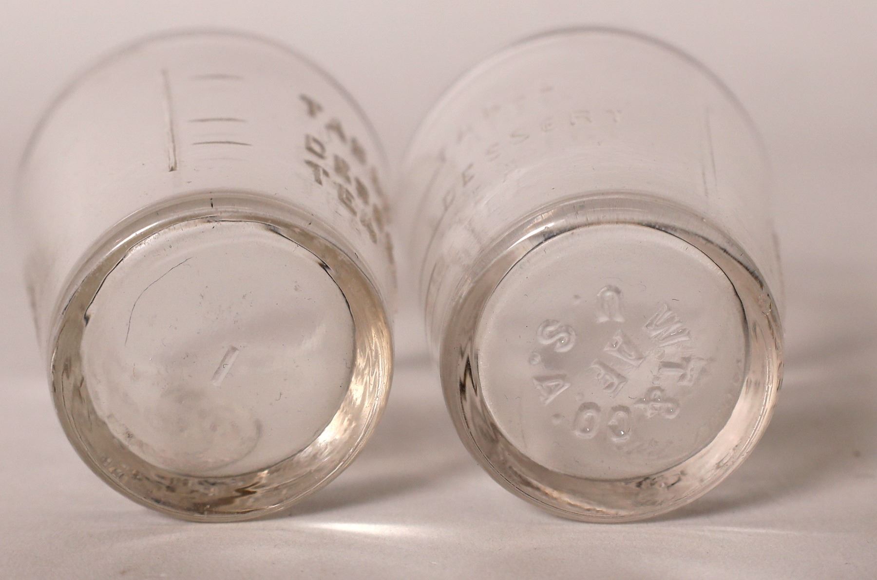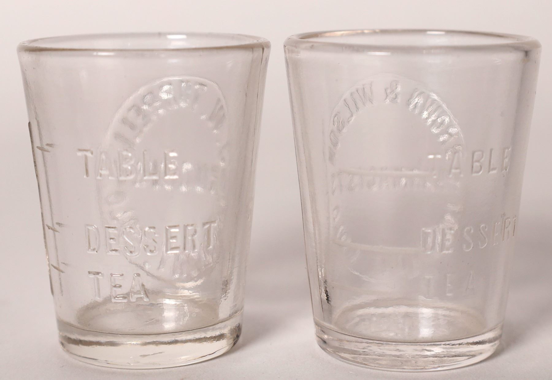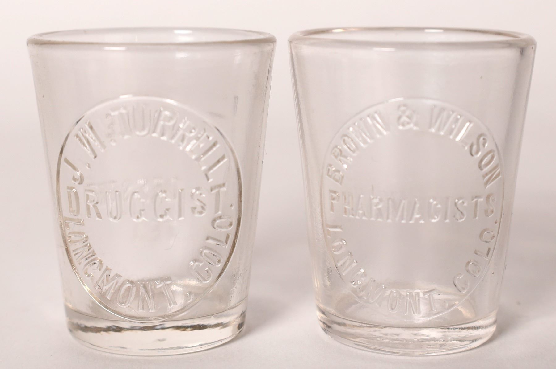 Two different Longmont, Colo. dose glasses, 2", clear, no apparent chips or cracks: J. W. Turrell/ Druggist/ Longmont, Colo.; Brown & Wilson/ Pharmacists/ Longmont, Colo. Longmont Colorado