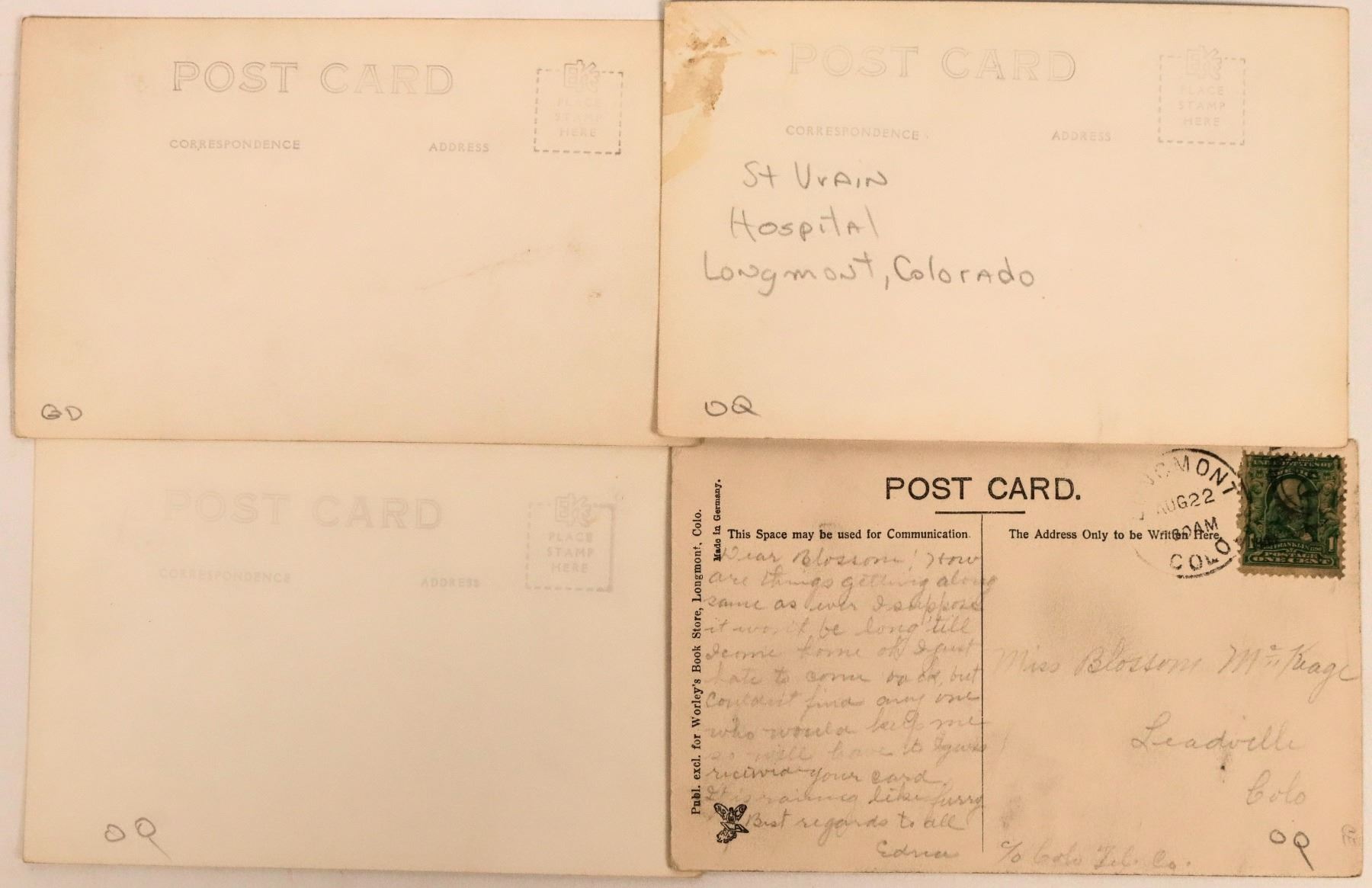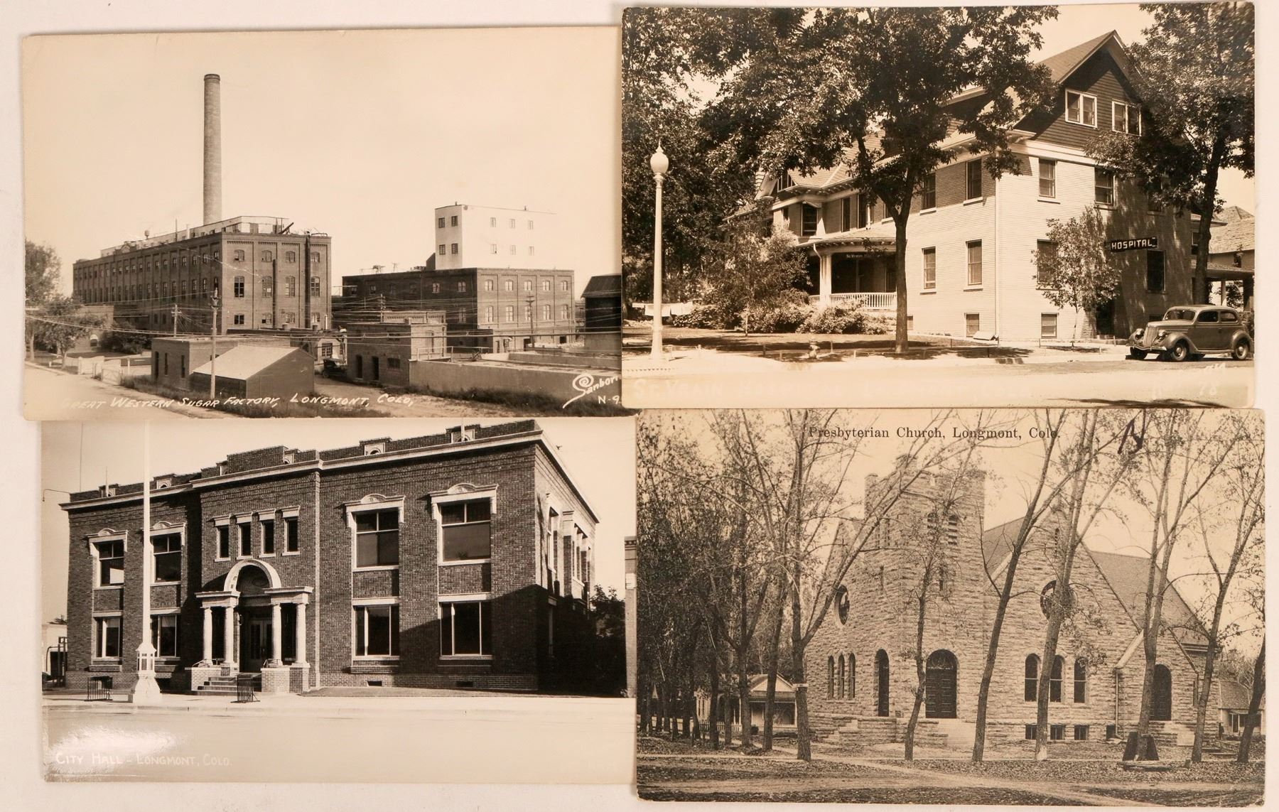 A group of four postcards from Longmont includes a super nice one of the Great Western Sugar Factory and a real photo of the St. Vrain Hospital. City hall and the Presbyterian Church cards round out the group. View photos for closeups.