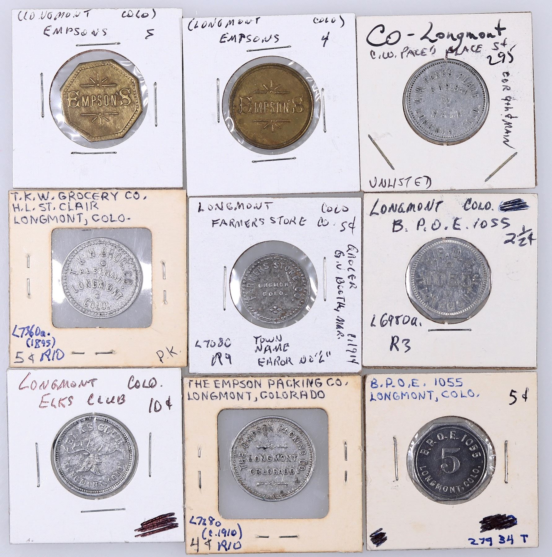 This Boulder County town is one of the few towns with 4 cent tokens. Lot of nine tokens: Elks Club (3); Farmers Store; The Empson Packing Co.; T. K. W. Grocery Co.; C. W. Pace's Place; Empson's (one five cent, one four cent).