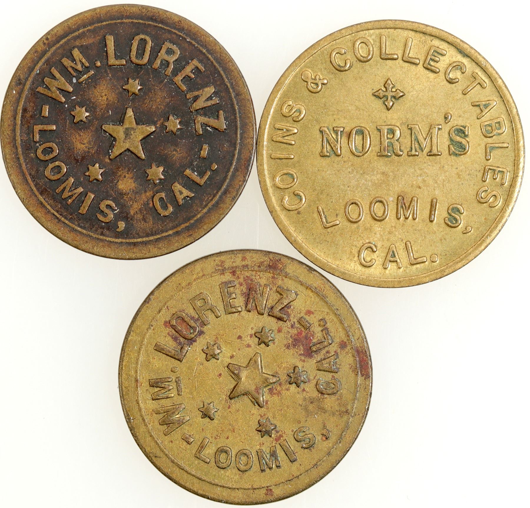 3 Loomis tokens. Wm. Lorenz-2 different, Norm's Coins. Loomis California