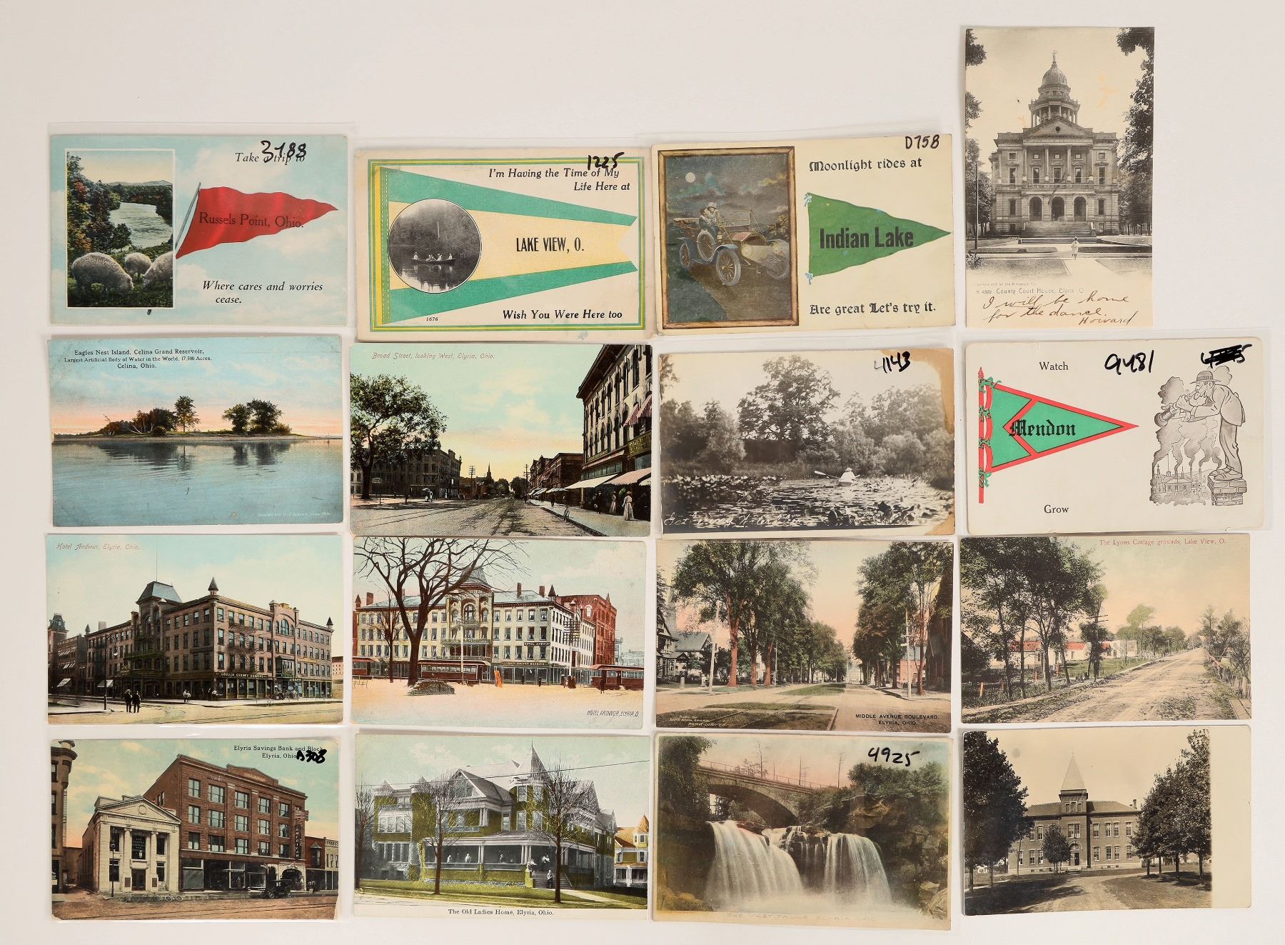 16 Elvira postcards. RPC's-2 story building, pond with stain. Also, Lyons Cottage, Indian Lake, Lake View, Russels Point, court house, Broad St. etc.[ Lorain County Ohio