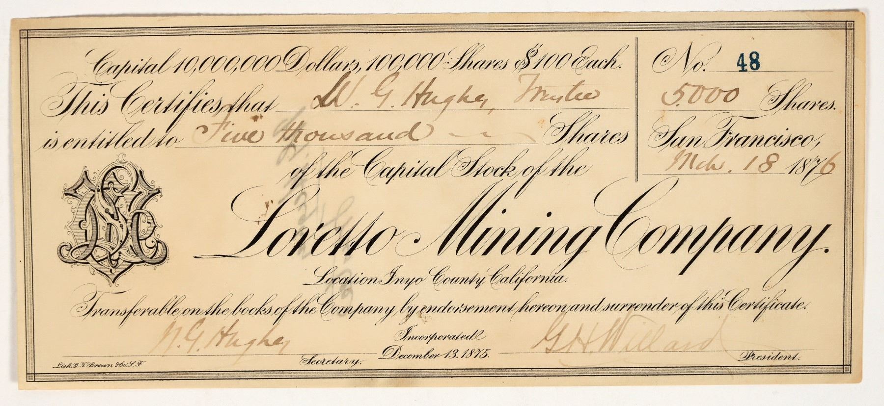 Inc. December 1875. "Location Inyo County California" (printed under title). No. 48, issued for 5000 shares to secretary Hughes in 1876. Signed by Hughes and president Willard. Not cancelled. Black border and print, fancy logo. Printed by noted African American lithographer G.T. Brown, SF. 4 x 9" Toning. Located out of Darwin in the heat of Death Valley. Pat Reddy famed lawman and gunslinger) incorporated the Loretto Mining Company which he sold in January 1876. A few months prior to the incorporation, with the help of Inyo County Sheriff Elder, the Reddy brothers wrestled control of the main Darwin mines from Raphael Cuervo, their first proprietor ("Darwin, California" by Robert Palazzo).