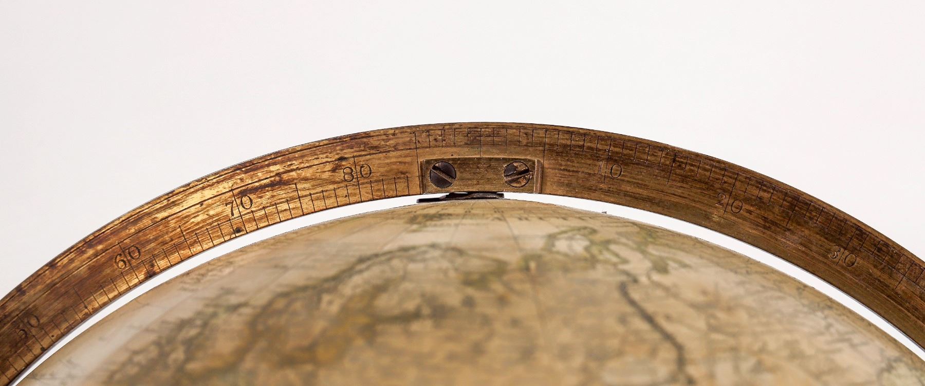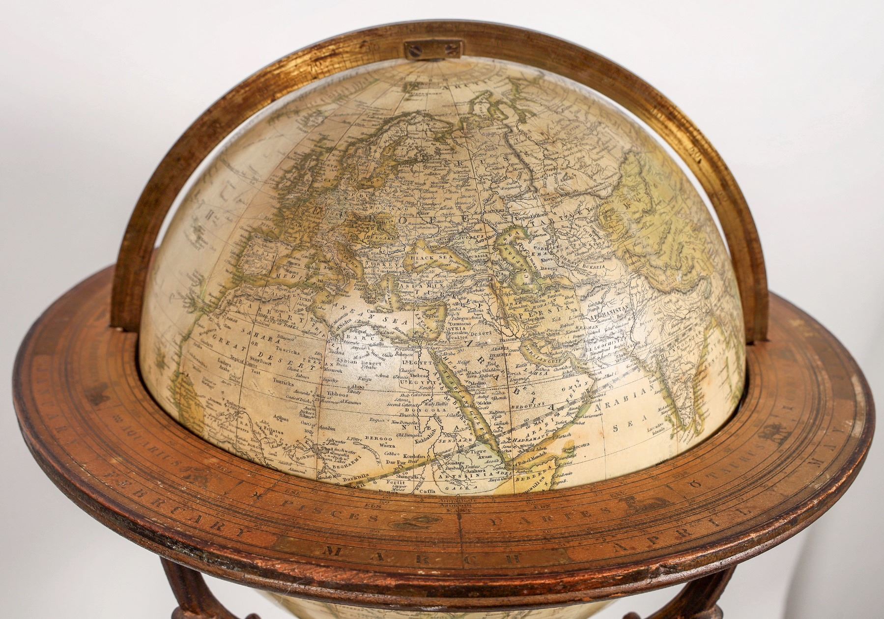 The globe shows wear, perhaps typical of an item 160 years old. there are some scratches to the surfaces (not in USA) of the globe and outer info ring. All metal parts present, including tightening screws, and all otherwise in very good condition. There is a darkening of age (sometimes called patina) on the globe and outer info ring.