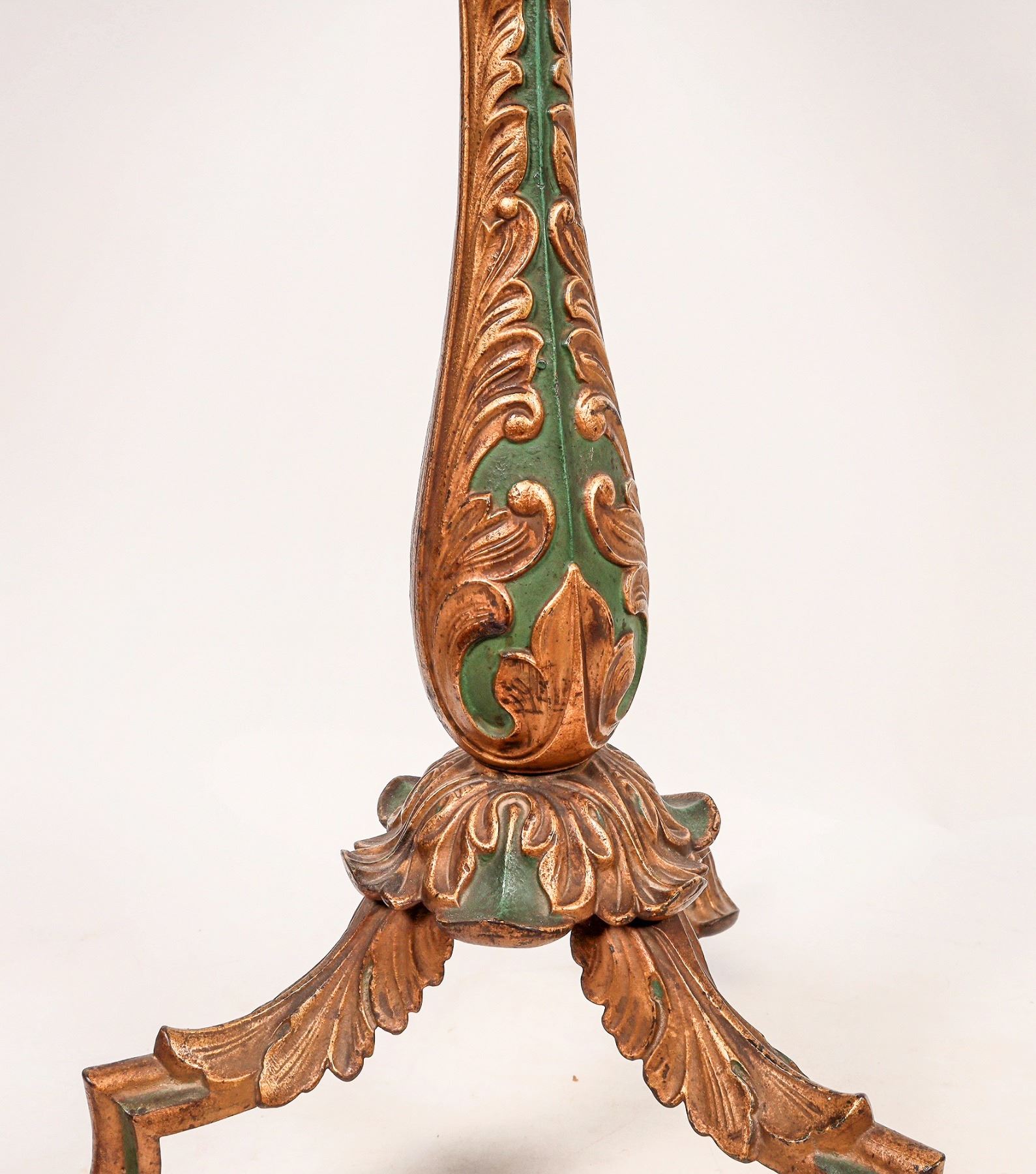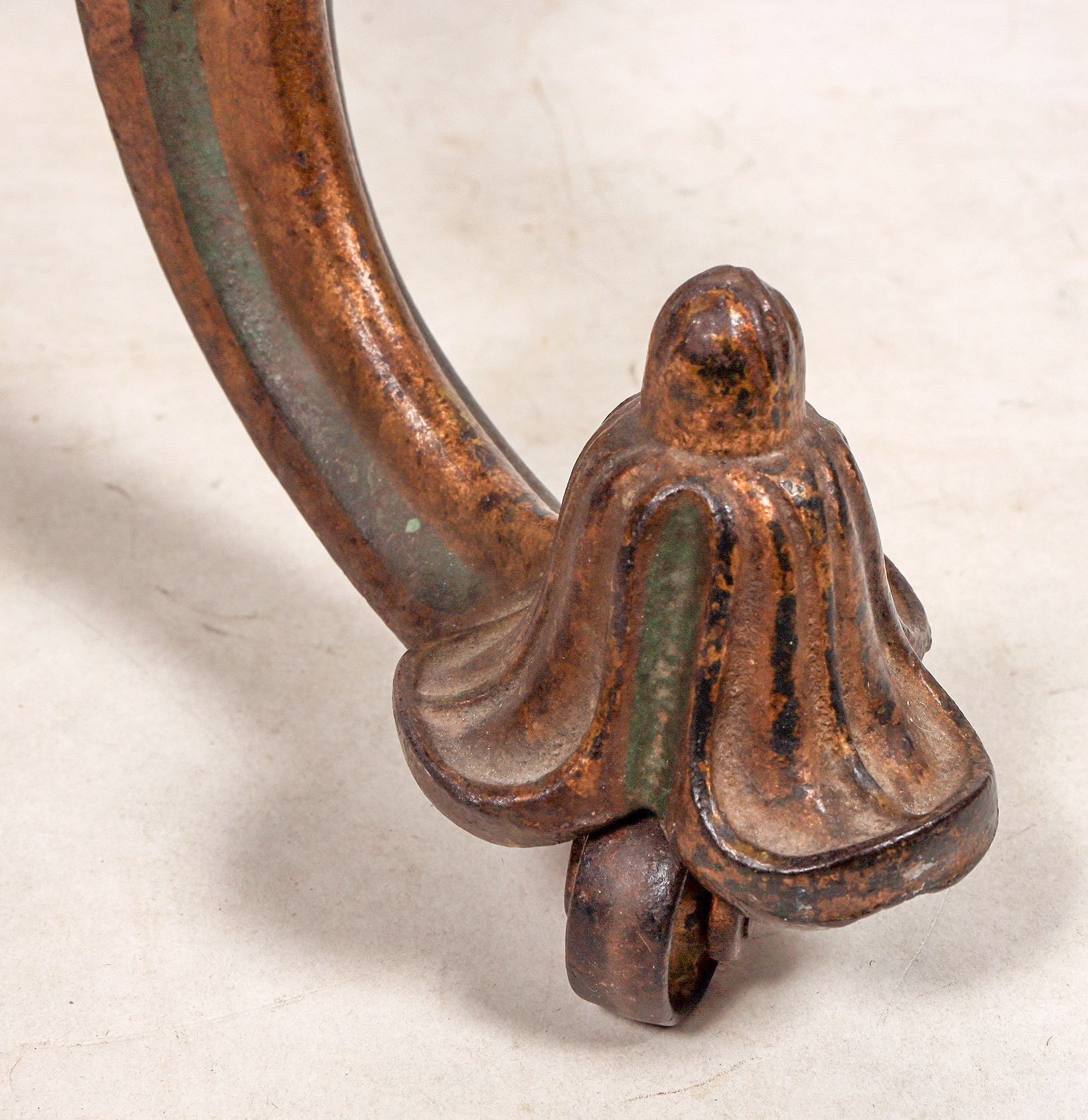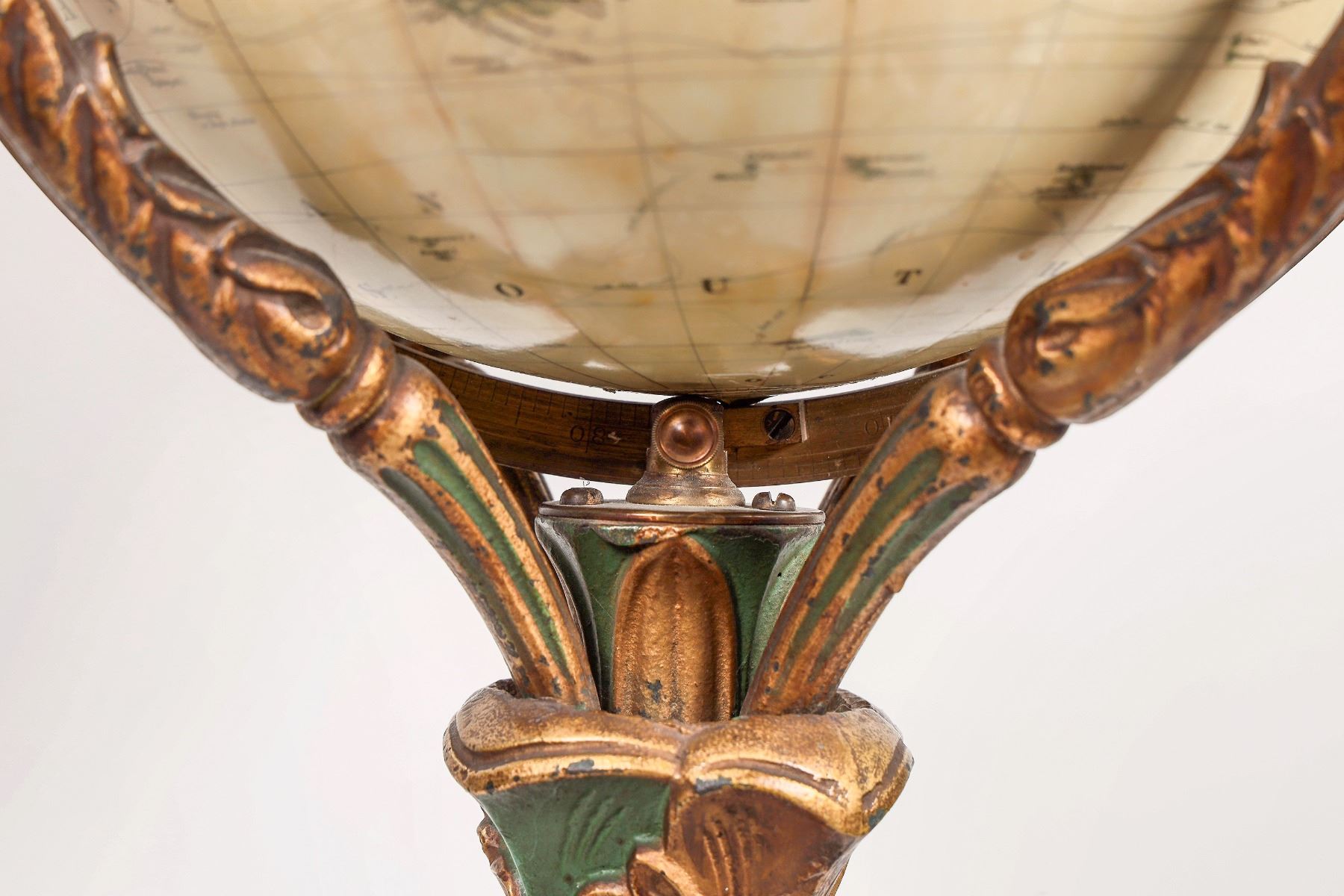 The globe is 12" diameter. The stand is 41" tall, original hand painted cast iron in gold and green tones, wheels concealed on the bottom.