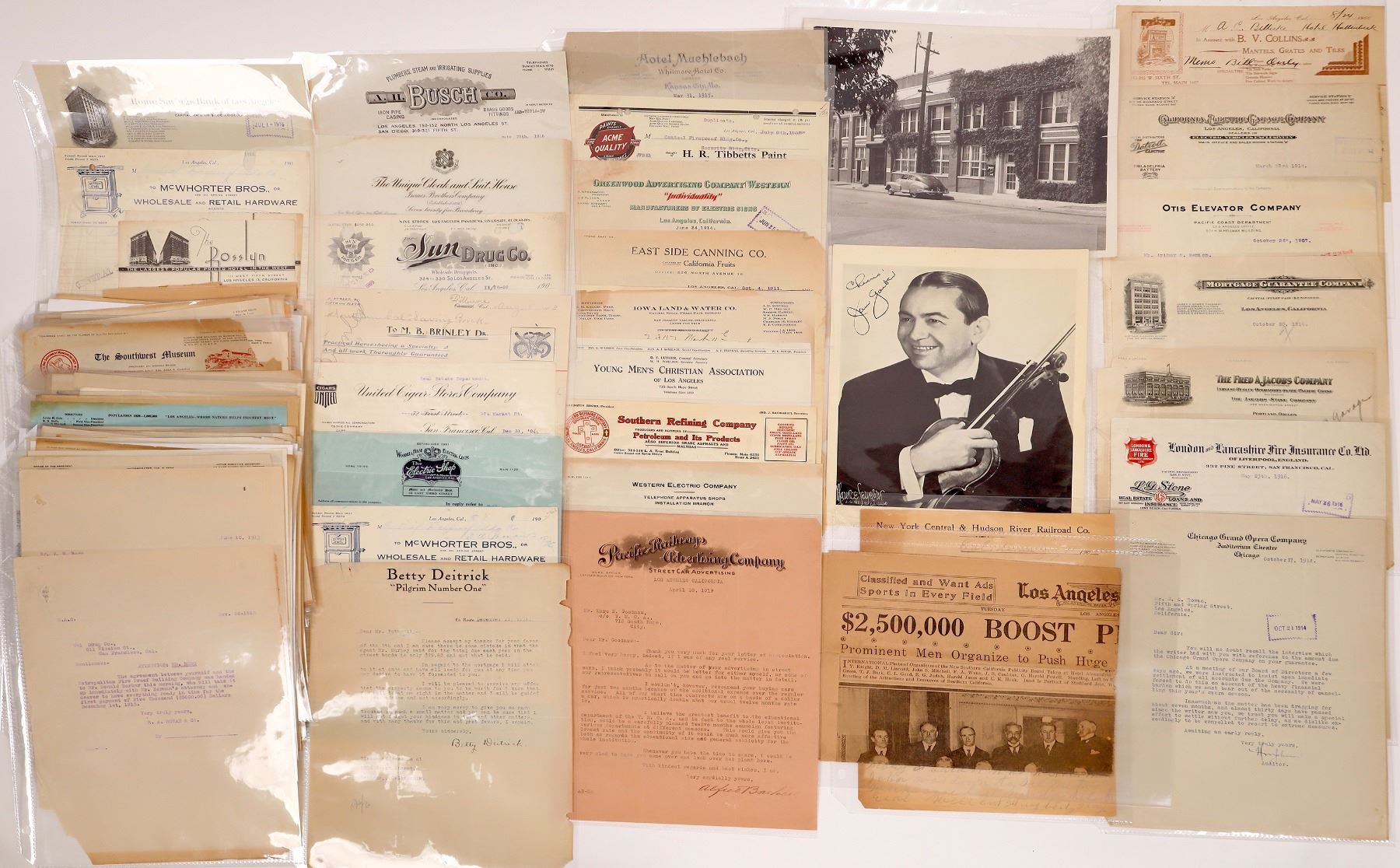 Lot of over 130 items. Letterheads & billheads from various enterprises throughout Los Angeles, c. 1900 - 1920. Most are typewritten. Several have ornate vignettes in their company logos. A few photographs and newspaper articles round out this unique look back into early 20th century Los Angeles.