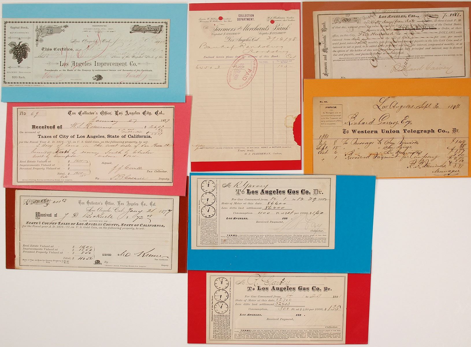 Lot of 8. Includes: Tax Collector's Office receipt, 1877, signed by J.J. Carrillo, who was the City Marshall, Chief of Police, & Tax Collector; Western Union Telegraph billhead, 1881; Farmers & Merchants Bank promissory note, 1881 and receipt, 1888; two Los Angeles Gas Company Receipts, 1881 & 1882; Los Angeles County tax receipt, 1877; and 1910 issued stock certificate for the Los Angeles Improvement Company. Please inspect. Date: 1877-1910 Location: Los Angeles, California HWAC# 60416