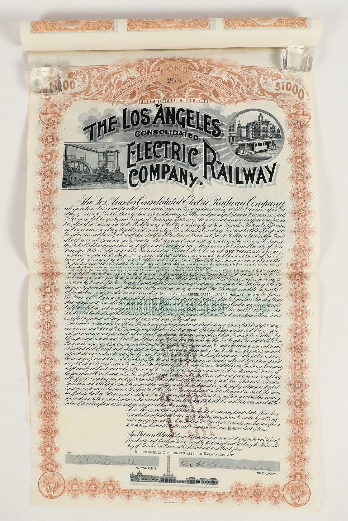 This is a bond issued by the Los Angeles Consolidated Electric Railway Co. dated 1922. Most coupons are still attached. Please see photo for details.