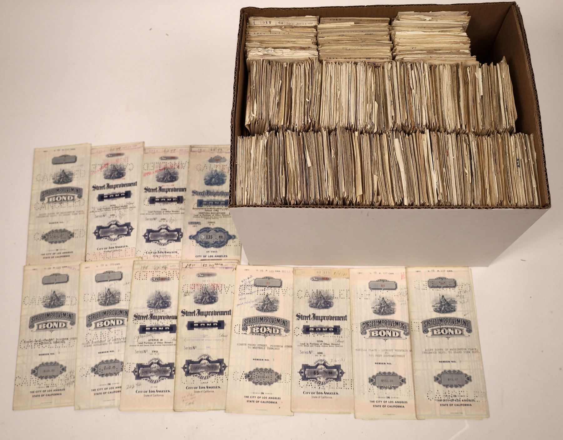 A full banker's box, 20 pounds of Los Angeles County improvement bonds. about 1500 pieces from all over Los Angeles County. State:California City:Los Angeles Date: Provenance: