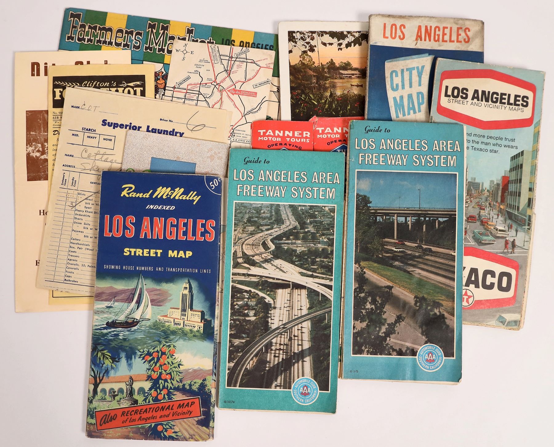 Lot of 22 One Souvenir Sombrero (2") pin ad for L.A. Times (possibly 1920's). 7 road maps from AAA, Mobile gas, Texaco, Rand McNally. Pictorial postcard 12 pack (1948), Four Gray Line tour schedules (1940's), 4 business cards, Natural Foods of Calif. booklet (1925), 1925 Farmers Market Souvenir Booklet ,three misc. receipts and brochures. Various conditions.