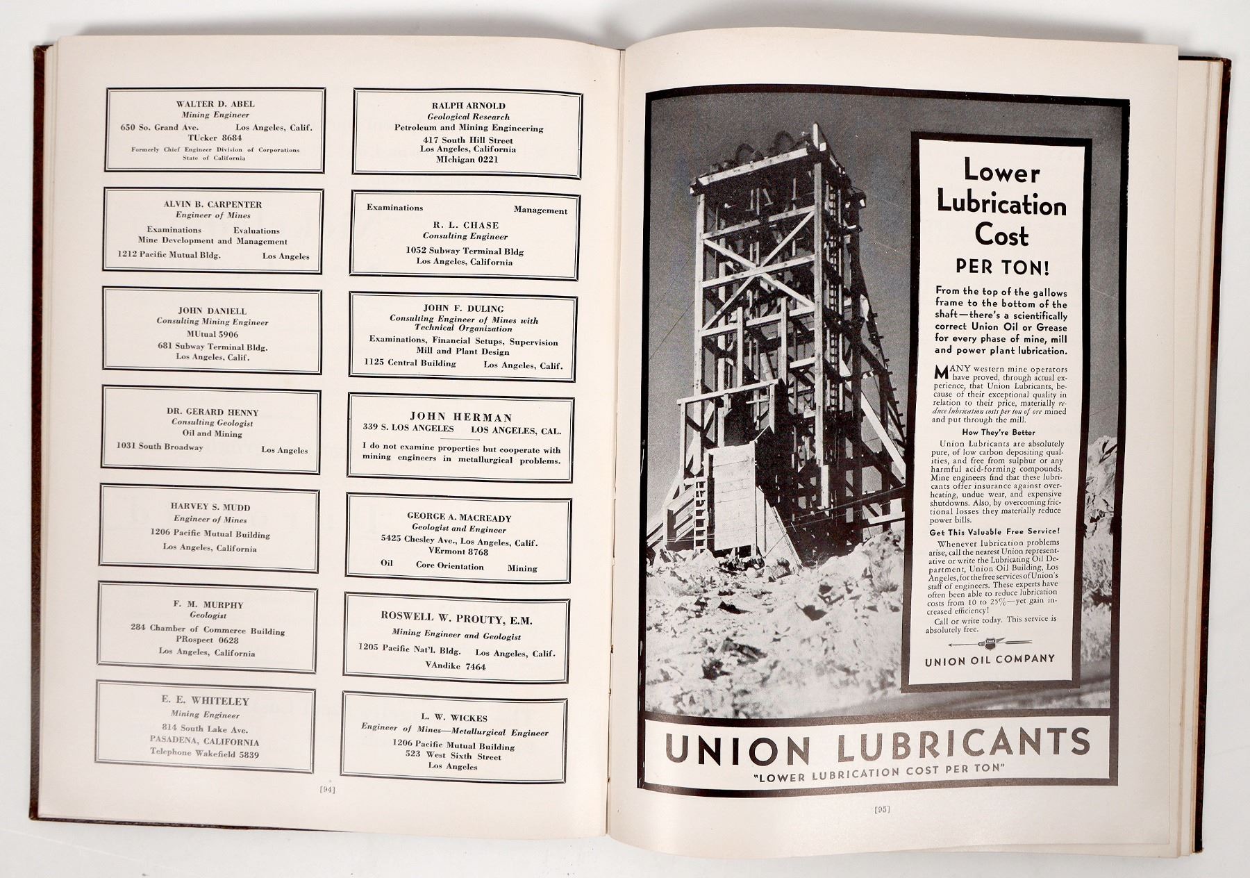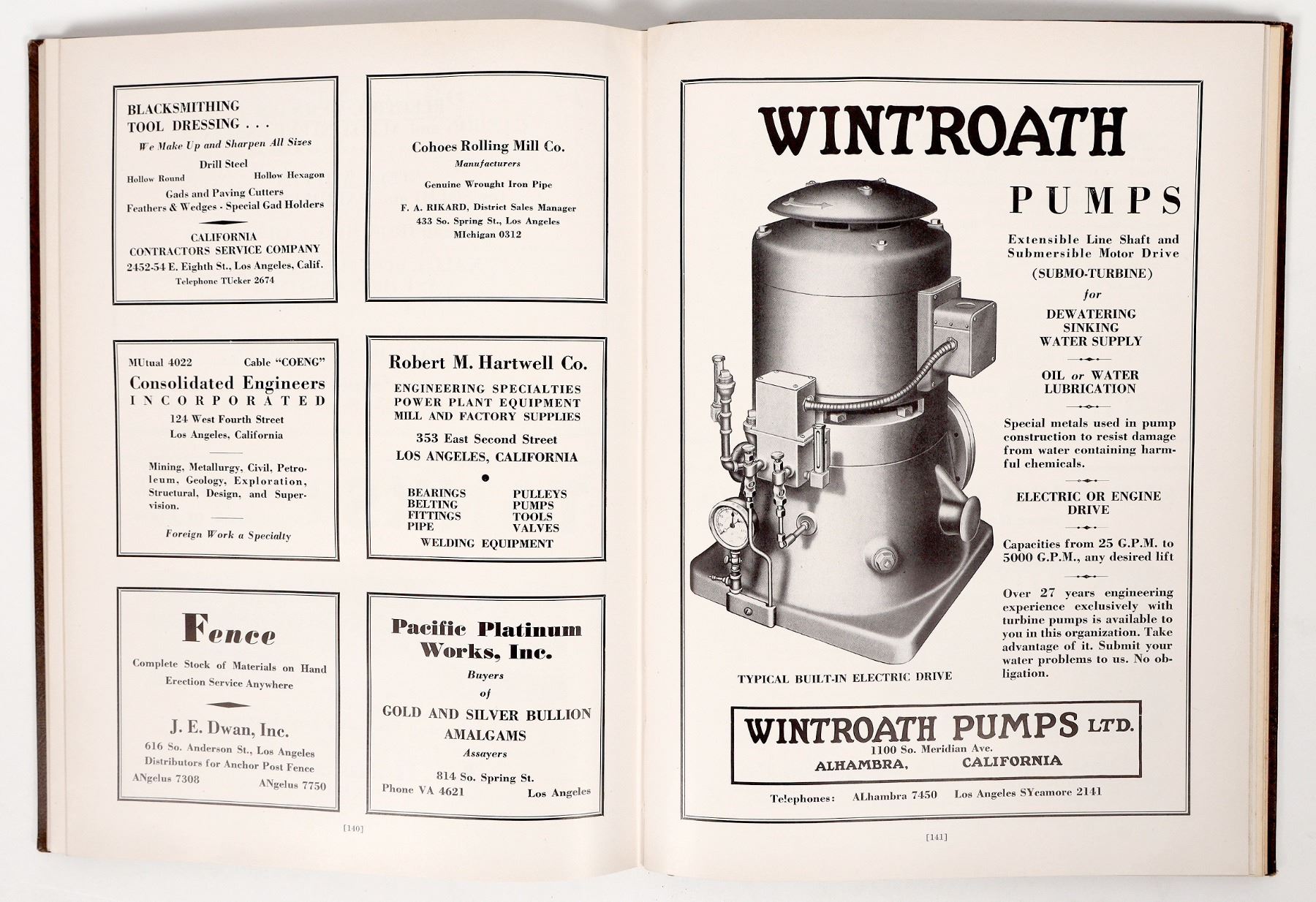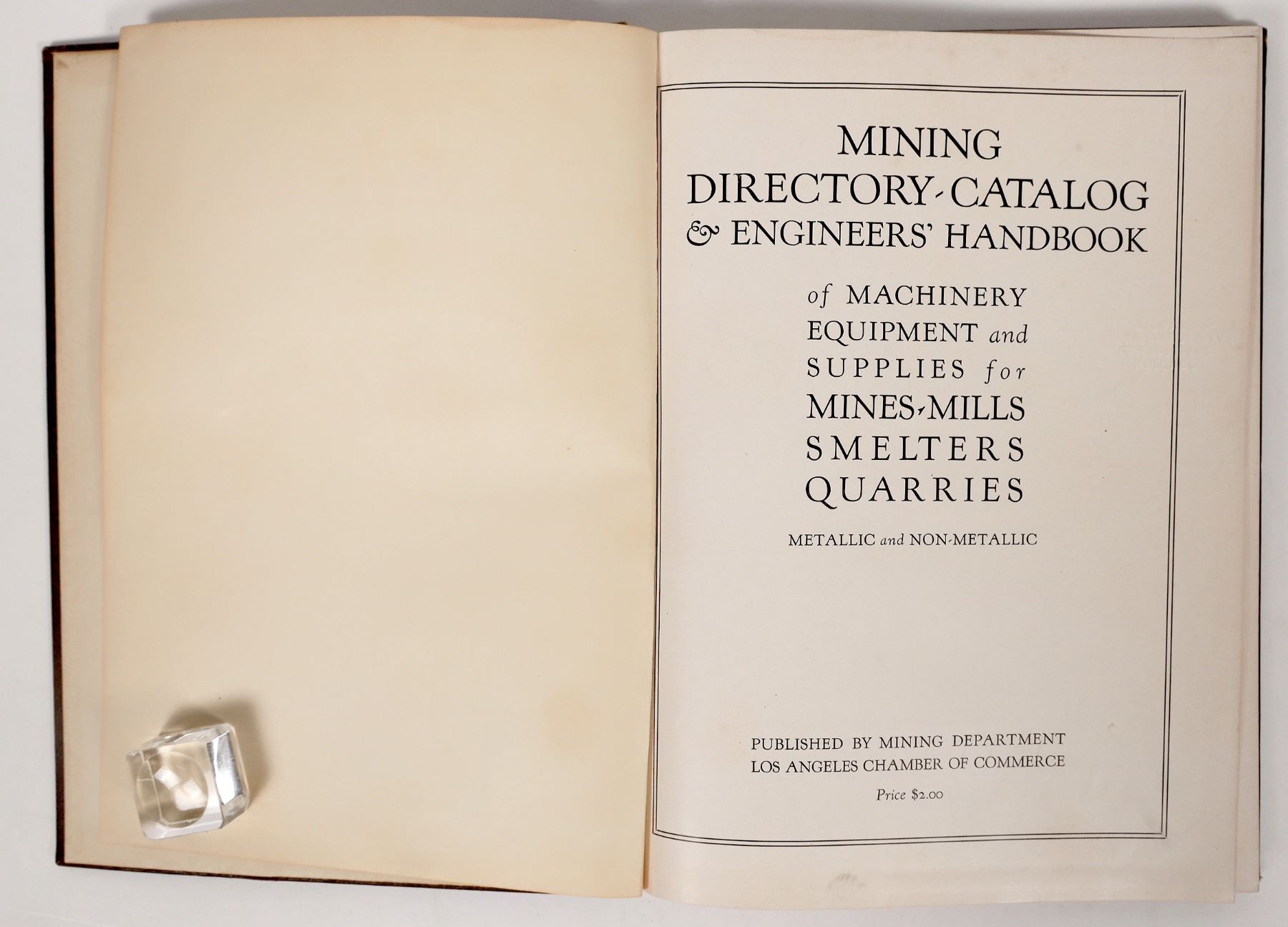 A copy of 'Mining Directory/Catalog and Engineers Handbook: Los Angeles County', published in 1932 by the Los Angeles Chamber of Commerce. It contains scientific, legal, and economic references for miners as well as pages of advertisements for industrial and mining equipment. Hardback, approx. 200 pages. Very good condition for its age; some minor wear on spine and corners.