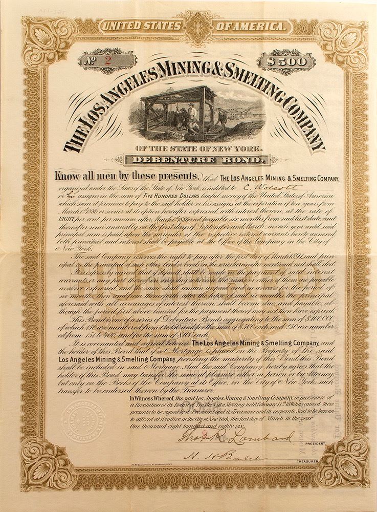 Incorporated in New York. $500 Debenture Bond certificate #2 issued to C. Wolcott. Signed by Thomas R. Lombard as president and H.H. Balch as secretary. Vignette of a group of miners extracting ore from the shaft. Coupons attached to the right. Uncancelled. Printed by F.F. McBreen, N.Y. After hearing about a rich strike of silver-lead ore in the Resting Springs district in 1874, "Professor" William D. Brown and his brother Robert D. headed to the Amargosa east of Death Valley in 1875 to look for more. They found it just south of Resting Springs on the old Spanish Trail. It was an "immense body of splendid ore" which they named the Balance (Lingenfelter). They promptly sold an interest to George Hearst and formed the Balance Cons. Gold and Silver Mining Company. Hearst had previously missed a chance at the brother’s Darwin discoveries. Jonas Osborne, one of the first to arrive at the camp, bought some other claims from the Brown brothers. By 1877, Osborne needed more capital to work the bulk ores but George Hearst had lost faith in the mines. So Osborne found new investors in Los Angeles and formed the Los Angeles Mining and Smelting Company. He then bought the Balance properties along with the Noonday and four other mines from the Brown brothers including one named the Gunsight. The Brown’s had started a town site they called Brownsville, and Osborne bought it for $100 and renamed it Tecopa. He then sold town lots at Tecopa before moving on to Resting Springs, six miles away where he installed the "Davis Pulverizer", a newfangled rotary mill. He then started selling lots at Resting Springs. Osborne’s mining venture went through many fits and starts and he even tried building a mini-Sutro Tunnel to tap the Gunsight lode, 800 feet below the surface croppings. With ore proving not to be rich enough, and the shareholders not willing to pay another stock assessment, the firm shut down in 1881. In 1883, Osborne bought the properties back and spent a lot of money and the next two decades trying to find a cheap way to get the ore to the smelter. He held on until 1906, when the Tonopah and Tidewater tracks came within 6 miles of the mines. Osborne then sold his interest for $175,000. The new owners eventually shipped $4 million of ore and it became the biggest metal mine in the whole of Death Valley and the Amargosa (Lingenfelter). Osborne likely carried on the company name through the twenty year period, so our certificate is from the second stage of the company’s development. Very Rare. VF. Fourteen coupons attached at right. Uncancelled. HWAC# 51227 Date: Location: Resting Springs, California