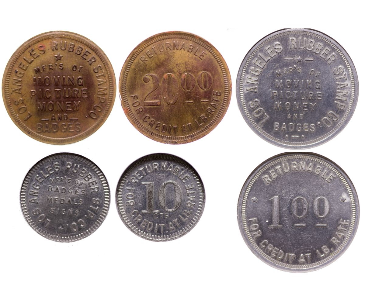 Lot of 3: obv.: Los Angeles Rubber Stamp Co. / mfr's of / moving / picture / money / and / badges; rev.: returnable /10cts, $1.00, $20/ for credit at lb. rate. NCS genuine, NGC MS62, MS63.