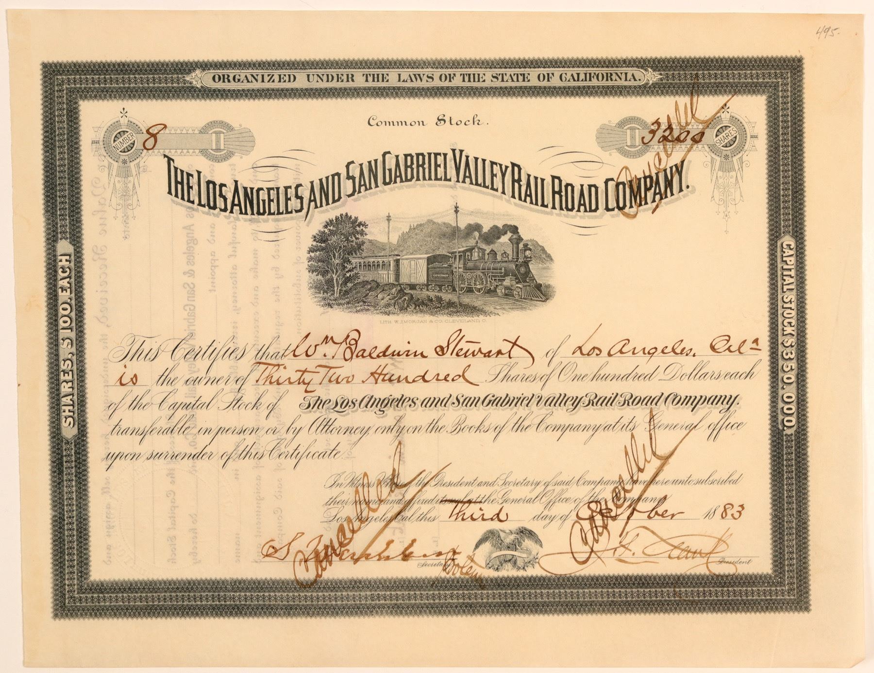 Inc. in California. Low number 8, issued for 3,200 shares to Wm. Baldwin Stewart on Oct. 3rd, 1883 in Los Angeles. Signed by president J.F. Crank and the secretary. Pen cancelled and slit cut in the middle. Black border and print, and locomotive vignette. Lith. by WJ Morgan & Co., Cleveland. Creases, some toning. 8.5 x 11" Founded by James F. Crank with the goal of bringing a rail line to Pasadena from downtown Los Angeles. Los Angeles and San Gabriel Valley Railroad was sold and consolidated on May 20, 1887 into the California Central Railway. In 1889 this was consolidated into Southern California Railway Company. On Jan. 17, 1906 Southern California Railway was sold to the Atchison, Topeka and Santa Fe Railway and called the Pasadena Subdivision. City: Los Angeles State: California Date: 1883
