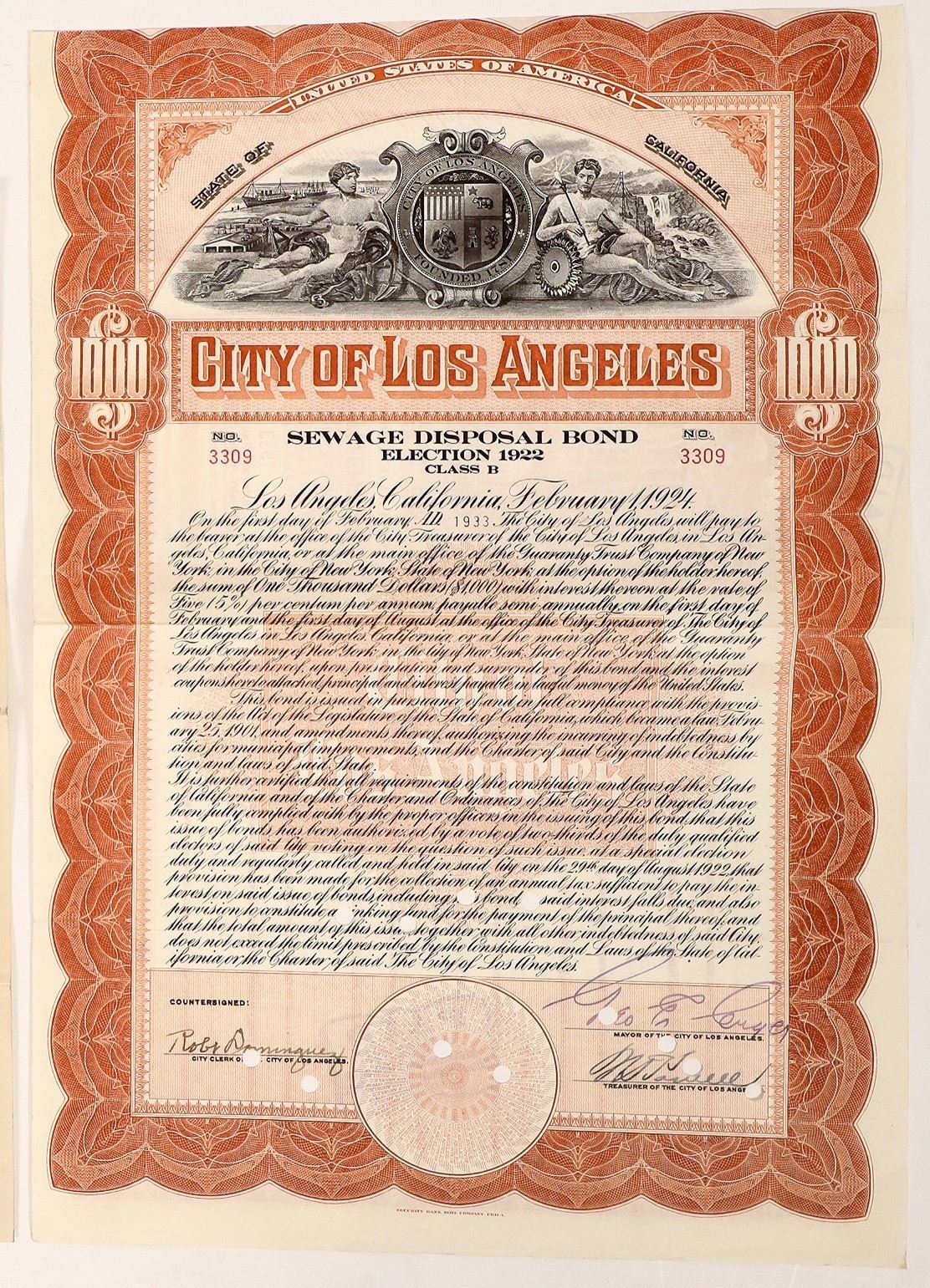 1922 $1000 sewage disposal bond.[ Los Angeles California