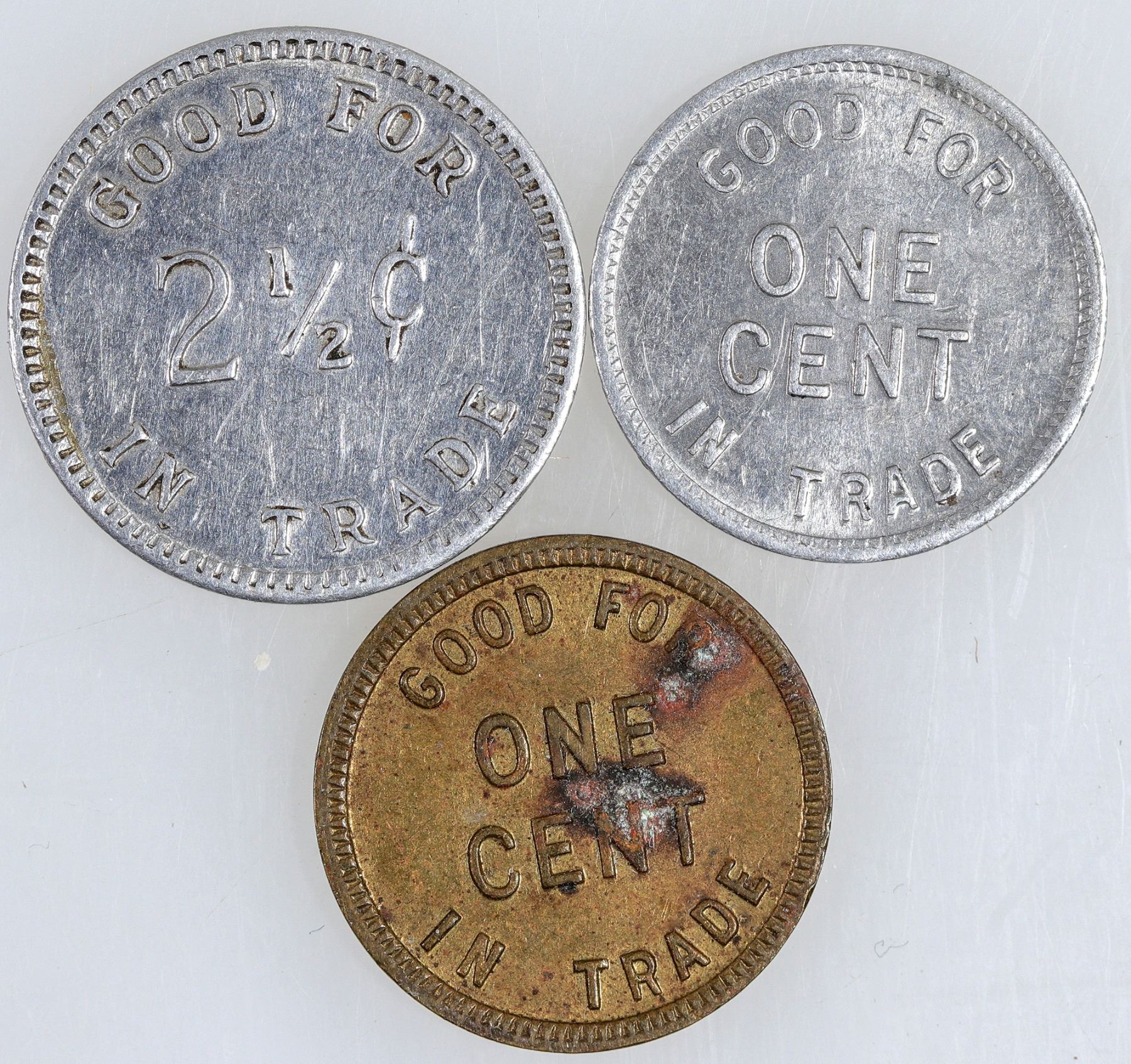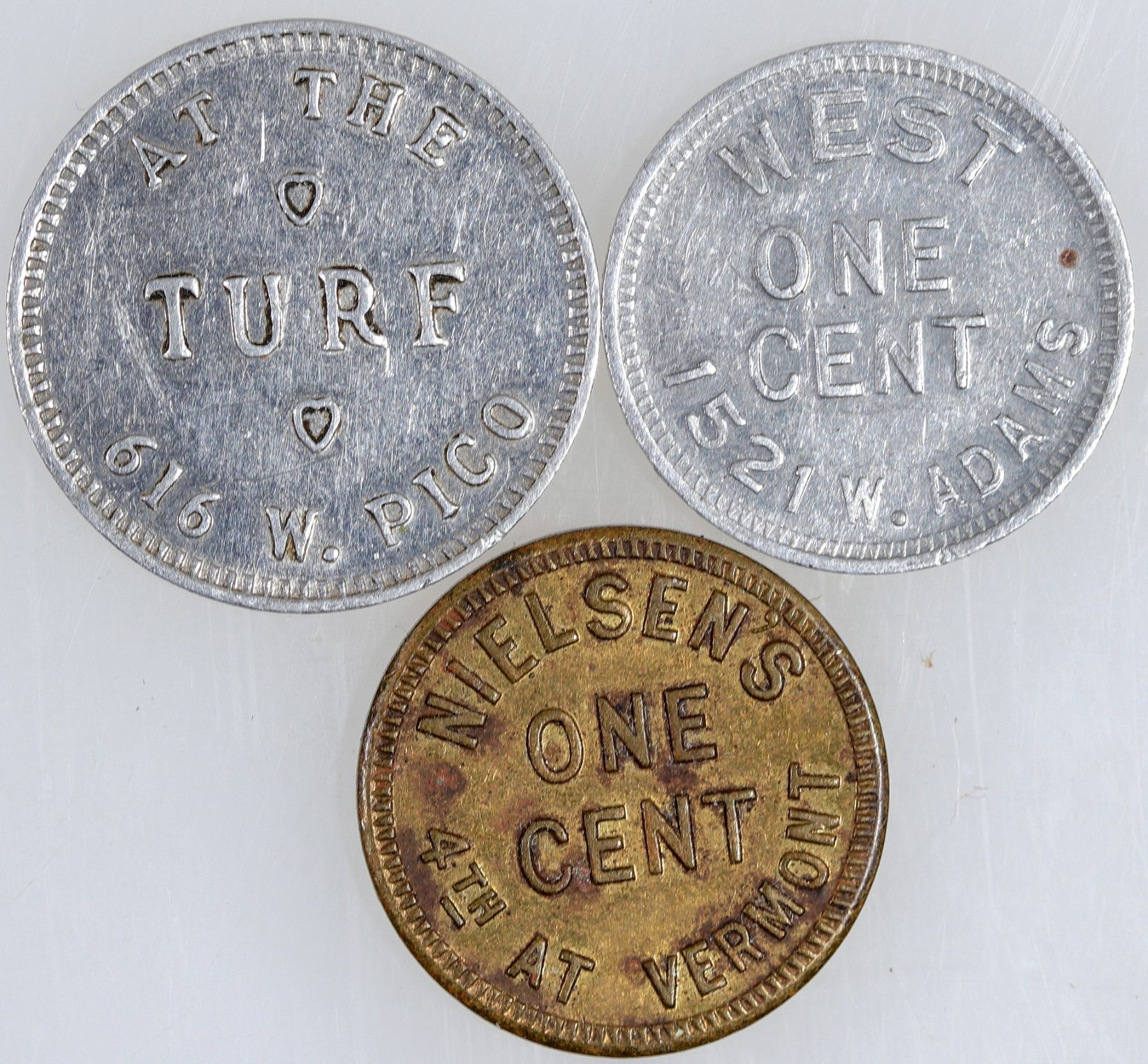 Lot of four tokens from the City of Angels: 1) At The Turf / 616 W. Pico // Good For / 2 1/2c / In Trade; Al. rd., 21 mm. 2 & 3) Nielsons / One / Cent / 4th at Vermont // Good For / One / Cent / In Trade; Br., rd., 19 mm. 4) West / One / Cent / 1521 W. Adams // Good For / One / Cent / In Trade; Al., rd., 19 mm. Los Angeles California