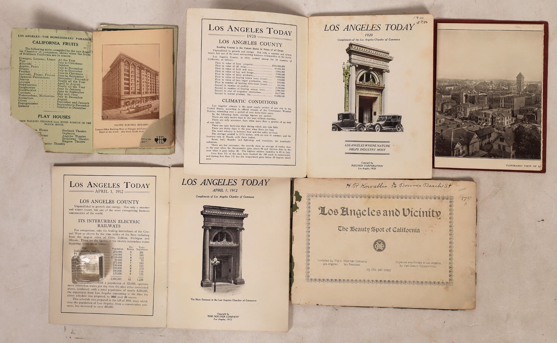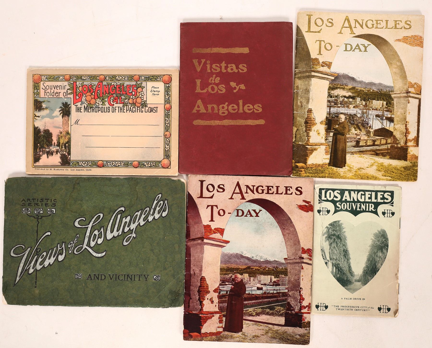 Tour books and pamphlets of the "City of Angels" Los Angeles, California. These publications cover the area from the early 20th century, up to around the 1930s. Titles include Vistas de Los Angeles, Los Angeles To-Day, Views of Los Angeles and more. Interesting look at what the city use to look like back in the early days. All in decent condition and very readable. Please see photos for more details. Los Angeles California Robert Coelln Collection