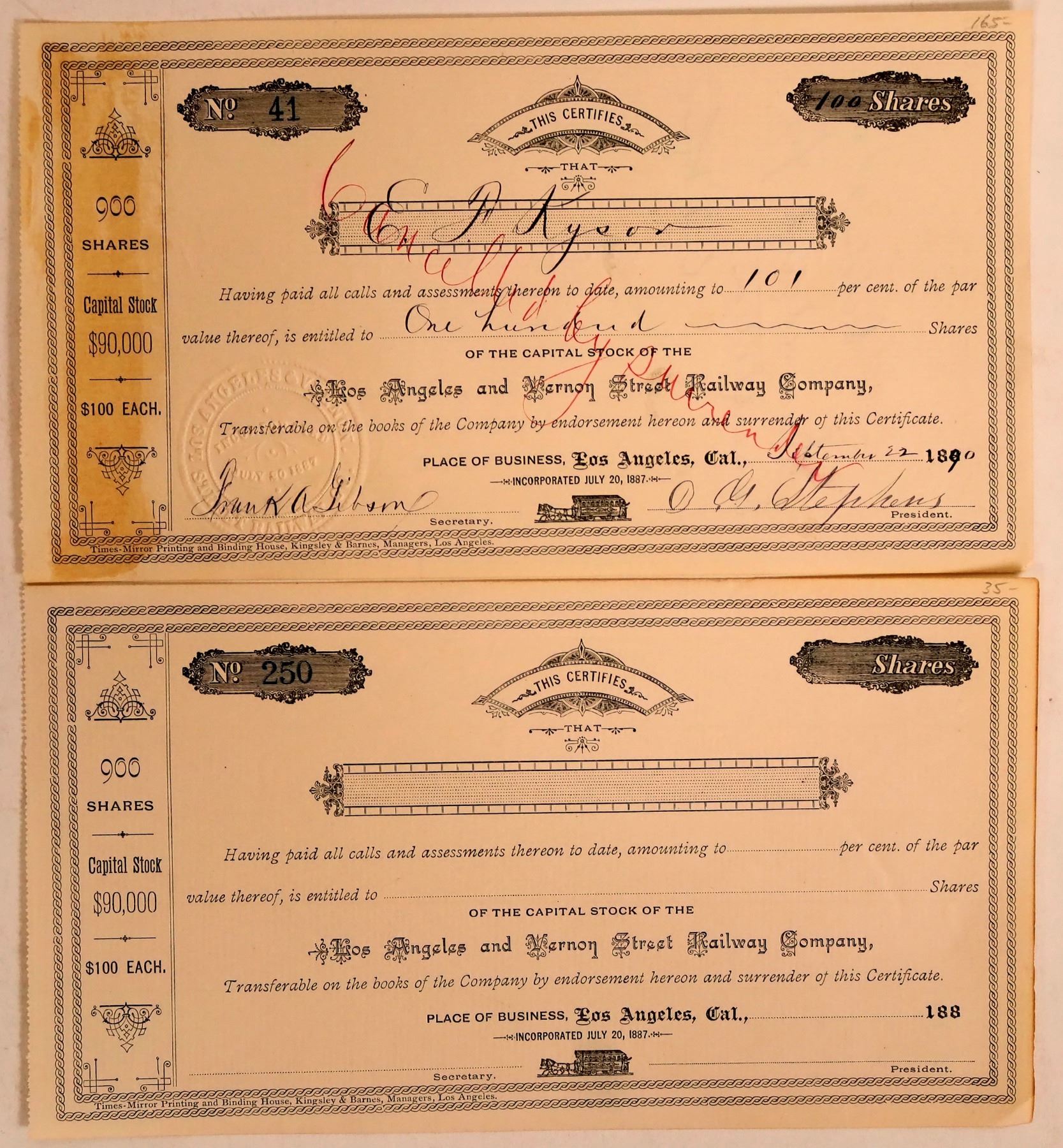 2 certificates, Incorp 1887. Company operated a horsecar line on Central Avenue from 5th Street to Vernon Avenue. It was purchased by the Los Angeles Consolidated Electric Railway in 1891. #41, I/C 100 shares @ $100 par issued Sept 22, 1890 (188- crossed out) signed D. Stephens President. #250, U/U, dateline 188). Black on pink paper. embossed seal (very clear), vignette bottom horse drawn street car. Times- Mirror Printing and Binding. EF.