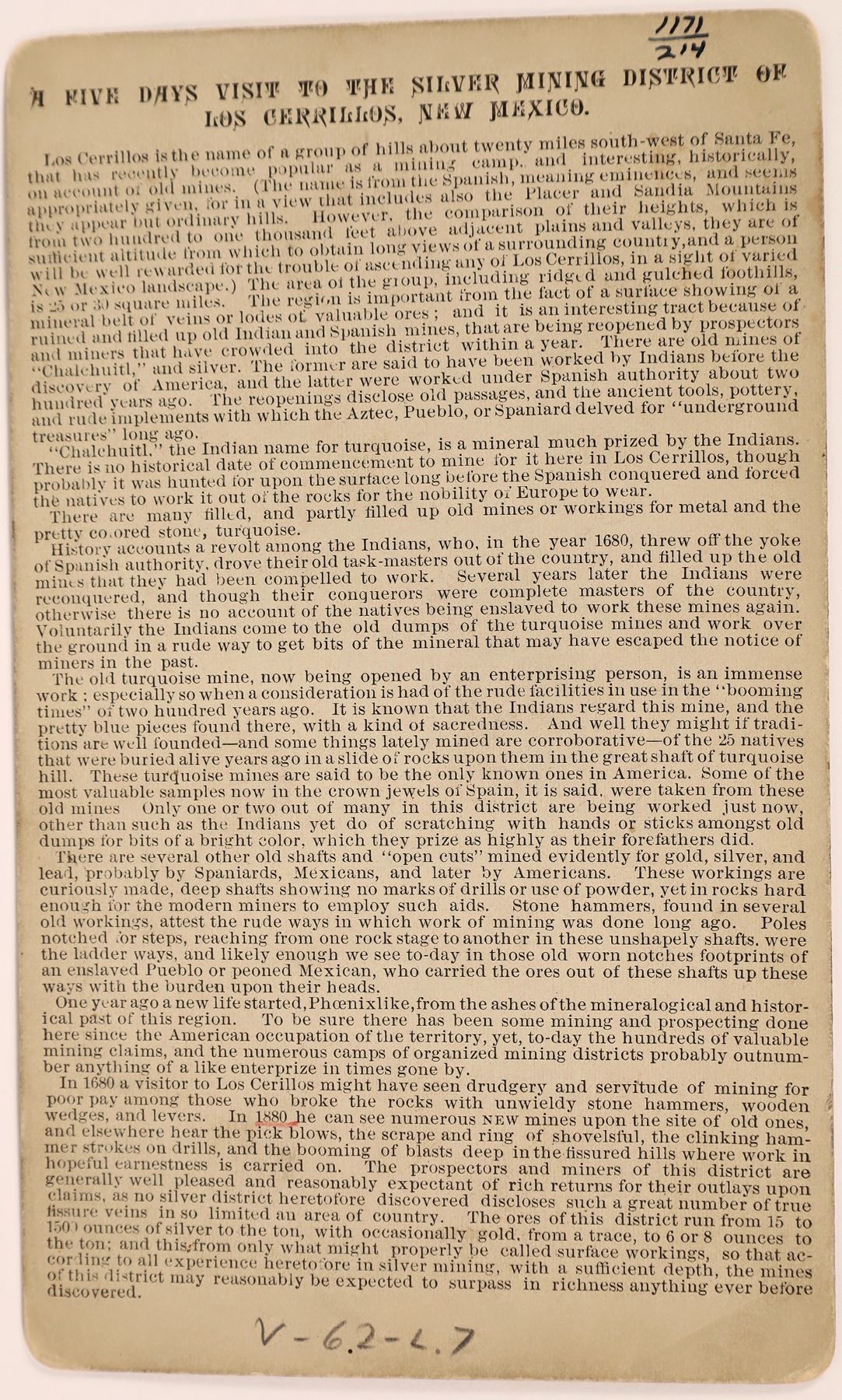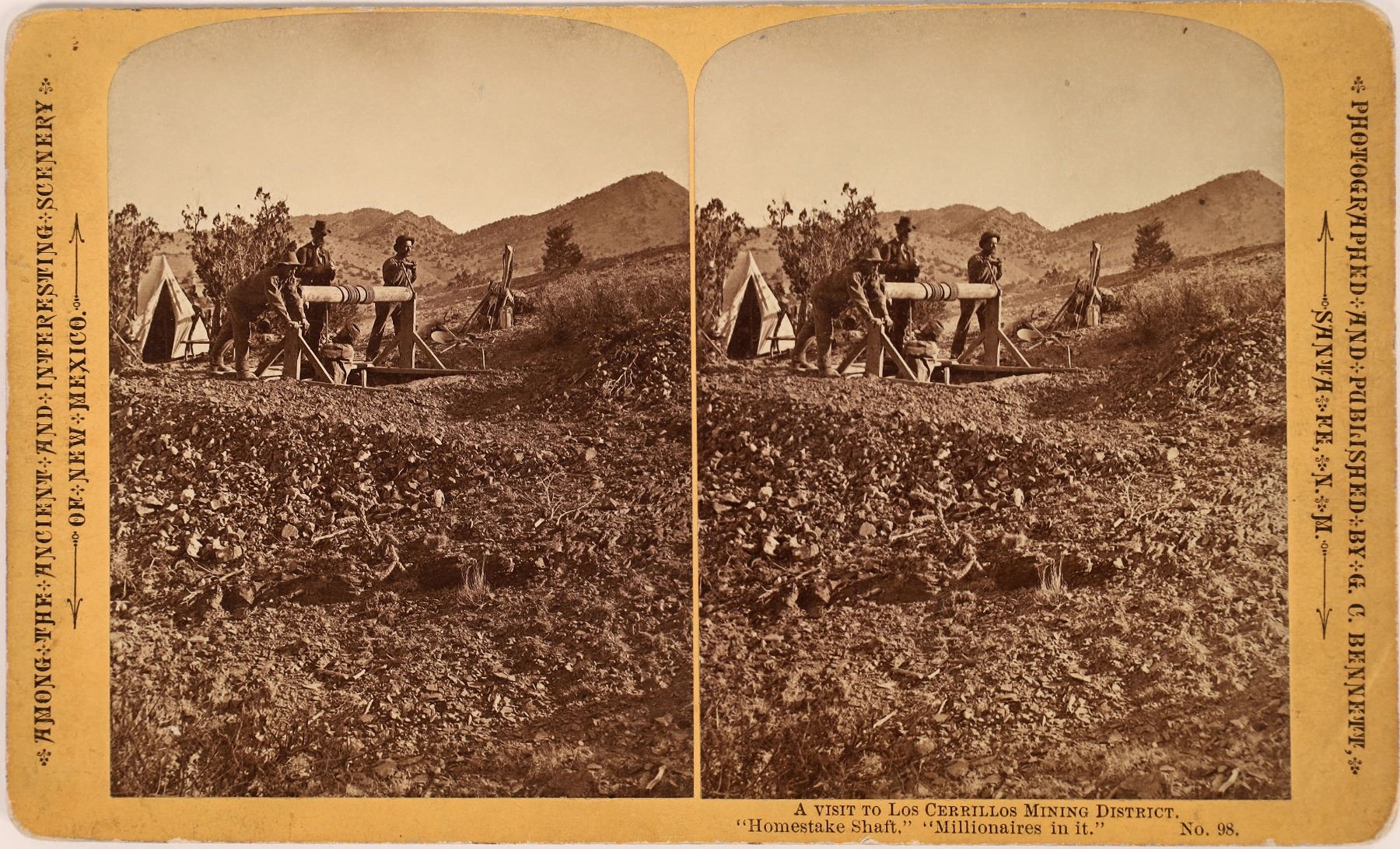 A real gem by G. C. Bennett of Santa Fe, New Mexico photographer. The photographs of the Galisteo and Cerrillos Mining Districts were taken in the Spring of 1880 by George C. Bennett . Some of the stereo cards state that a five day trip was made to the district for the purpose of making these photos. The exact date of the trip is not known, but was in the spring of 1880, as the photo of Carbonateville does not show even the start of the two story hotel that was constructed in May, 1880, in the foreground of the area photographed. Sharp contrast and excellent condition. The Cerrillos Mining District is about 20 miles southwest of Sante Fe. The reveres has a long story on Bennett's visit and the district.